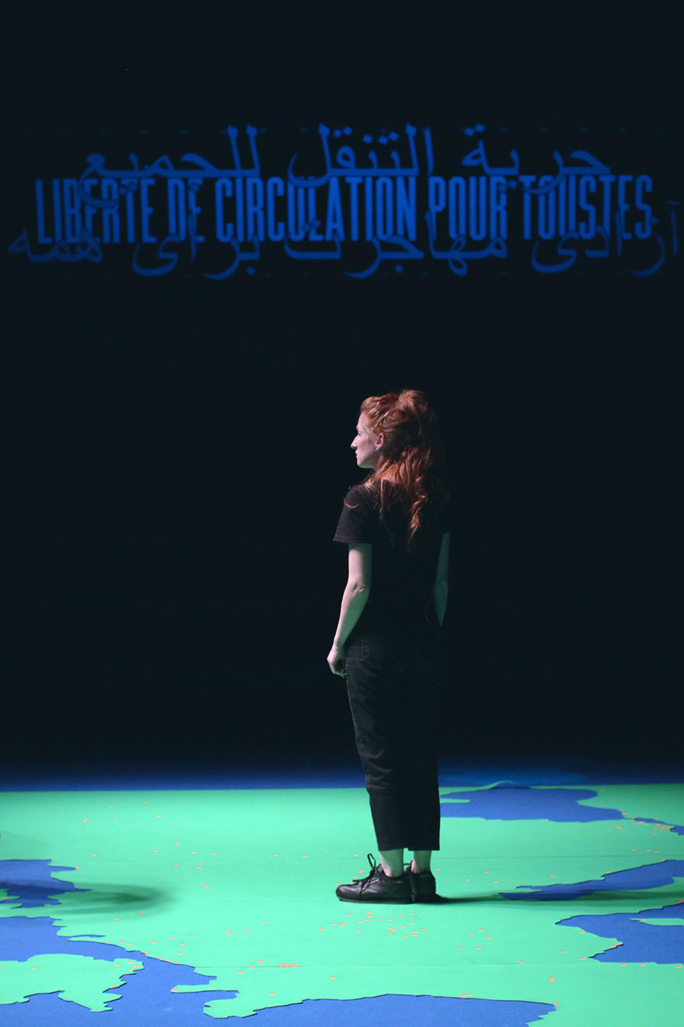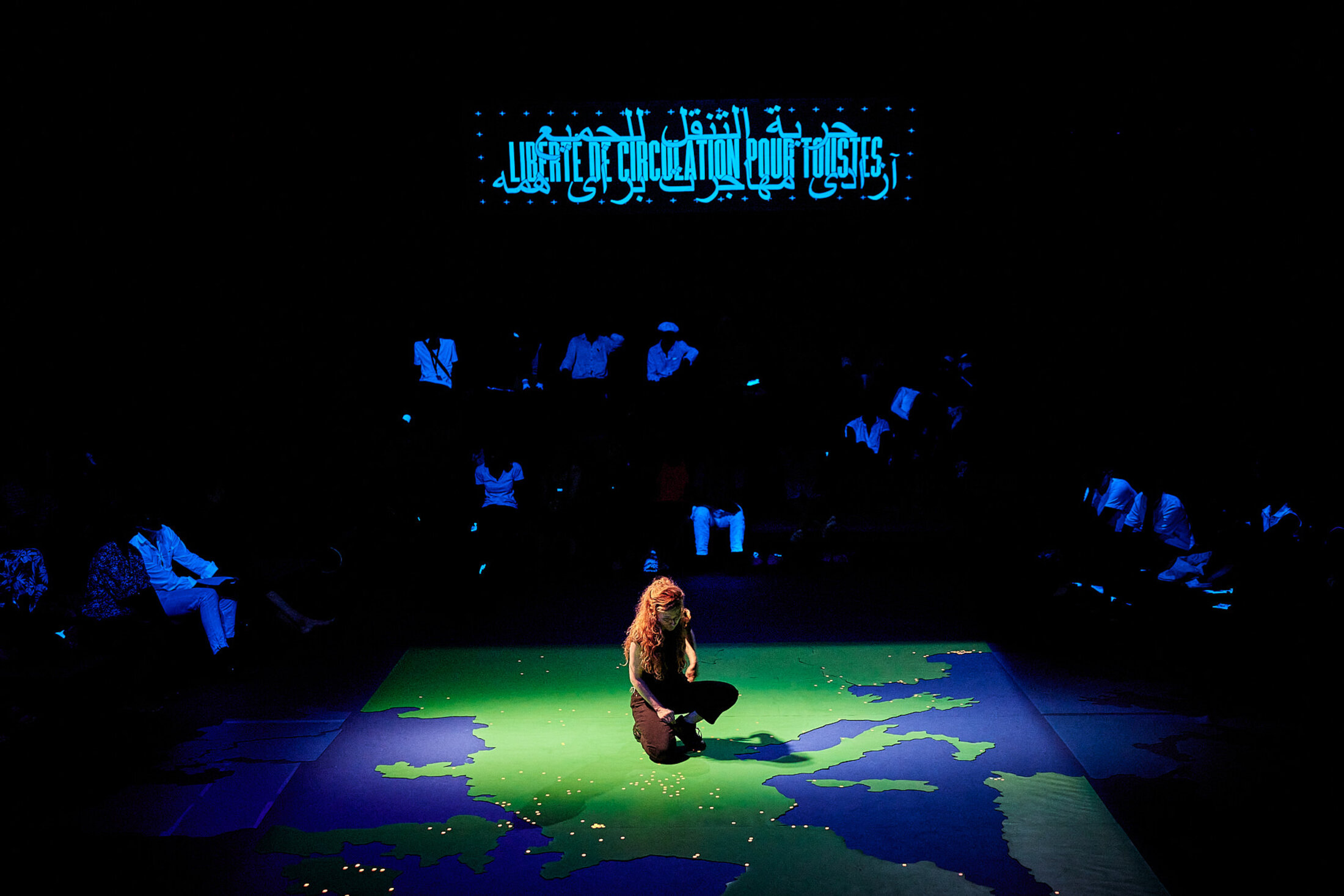 Cet espace quadri-frontal dessine à terre un planisphère géant, une « scénographie cartographique en partant du sol[3] », un espace pour se réunir afin de faire exister une communauté certes fragile mais avec ce fol espoir de commencer à résoudre ensemble ce à quoi les assemblées de politiciens ont échoué, pire, ont renoncé. Faut-il, au nom de la liberté de circulation en Europe en réhausser ses frontières extérieures en ignorant ceux qui chaque jour se fracassent contre elles ? Quelles vies valent la peine d’être pleurées ? Divisé en deux parties, la pièce rejoue la plaidoirie énoncée par le TPP, terrifiante au point de ne pas appeler de débat contradictoire, les corps des 27 364 personnes[4]disparues en Méditerranée depuis 2014 selon l’Organisation internationale pour les Migrations (OIM), suffisent. Cette plaidoirie est exposée en dix points par la comédienne Élise Marie qui reprend ici le rôle de représentant du ministère public, posant, de sa voix douce mais ferme, les enjeux glaçants de nos politiques migratoires : « Les droits des exilés sont bel et bien garantis par le droit international. Or les politiques migratoires nationales et européennes fondées sur la fermeture des frontières dressent des barrières devant certains migrants qui ne menacent pas seulement leur liberté de circulation mais aussi leurs droits fondamentaux[5] ». Dès les premiers mots, l’accusation pointe le caractère discriminatoire de ces politiques, en violation de la plupart des textes internationaux, y compris de la convention de Genève de 1949 relative à la protection des personnes civiles en temps de guerre.