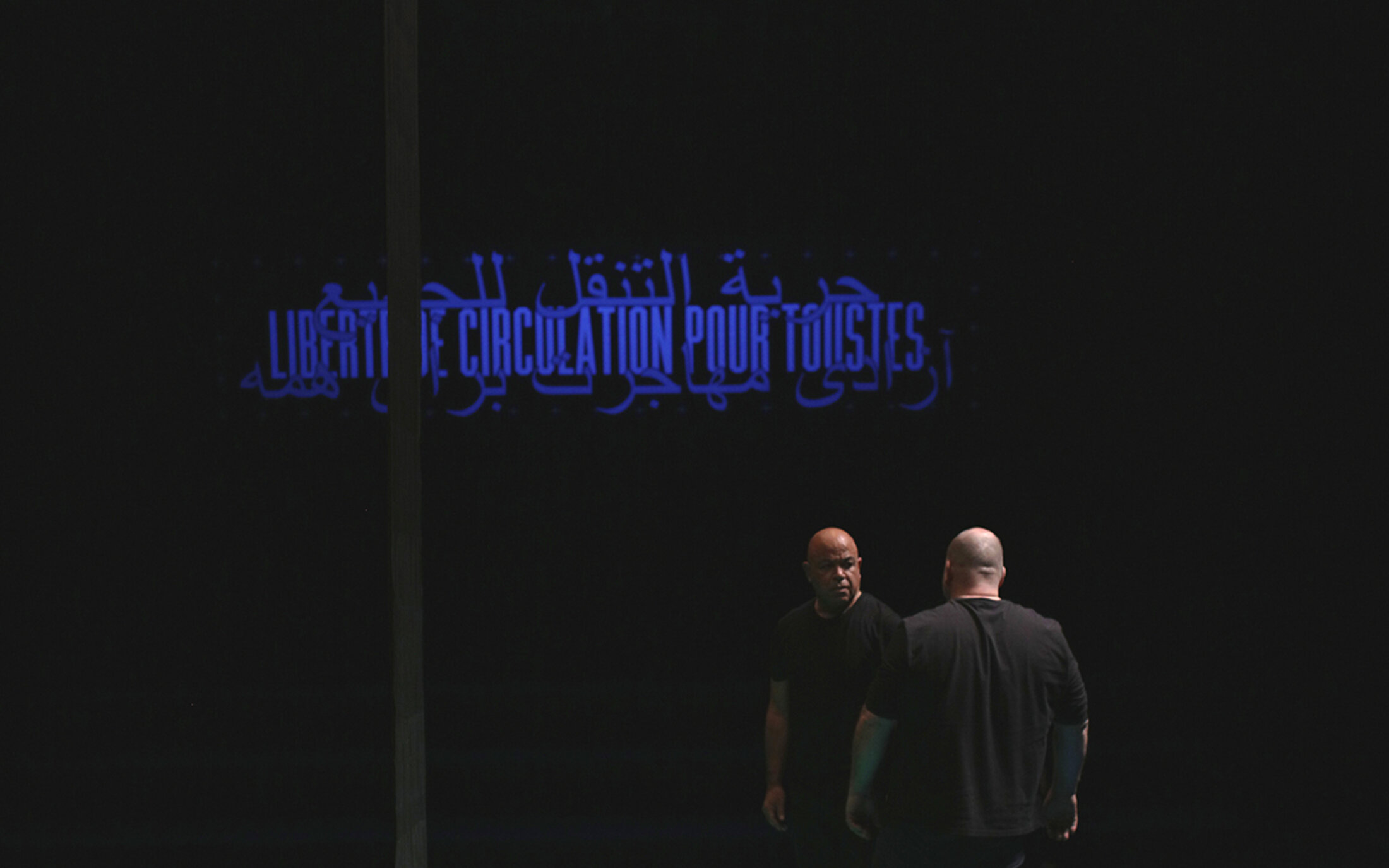 « Je cherche à créer un espace de contagion affective, parce qu’entrer en politique et en résistance, c’est une affaire d’humanité et d’affect » explique Patricia Allio. Surplombant les quatre coins de cette agora des peuples, au-dessus de la tête des spectateurs, apparaissent des phrases ou plutôt des slogans. Sur l’un d’entre eux est inscrit en lettres capitales : « NOUS DÉTRUIRONS LES CENTRES DE RÉTENTION ». L’assertion se poursuit avec les mots qui lui font face : « MUR PAR MUR, PIERRE PAR PIERRE ». Il n’y a pas de doute ici. Au bord du gouffre, vacillante, manquant de s’anéantir elle-même en dévorant ses propres enfants, l’humanité ne pourra être sauvée qu’avec la conviction de reconsidérer de façon radicalement différente les politiques migratoires, en faisant de l’hospitalité le pivot de ses actions. Fabriquer vraiment du commun pour donner, sans doute pour la première fois, un sens à la devise républicaine « Liberté, égalité, fraternité », inscrite depuis plus de deux-cent-trente ans sur chaque fronton de nos mairies, nos écoles… pour que l’idéal d’universalisme cesse enfin de n’être qu’une utopie. Au théâtre, la pièce est un moment rare. Bien peu s’intéressent à ces sujets. On peut citer les pièces d’Olivier Coulon-Jablonka et son Moukden Théâtre ou encore la proposition[10] des anciens journalistes Étienne Huver et Jean-Baptiste Renaud mise en scène par Marie-José Malis en 2022, qui ont quitté leur métier après avoir enquêté sur le sort des réfugiés en Libye. L’indifférence occidentale face à l’horreur les avait poussé à envisager une autre façon de raconter. Samuel Beckett (1906-1989) a cette réputation de donner une vision pessimiste de l’humain, son œuvre étant habitée par des personnages dérisoires consumés par leur passivité. Et si justement l’auteur irlandais évoquait plutôt le pouvoir qui reste à chacun d’entre nous d’échapper aux mises en conditions qui nous enferment constamment ? C’est précisément à cela que nous invite « Dispak Dispac'h », à disposer de ce pouvoir pour changer le regard que l’on porte sur l’autre, pour accueillir l’altérité. Au-dessus de l’agora des peuples est encore écrite cette phrase : « LIBERTÉ DE CIRCULATION POUR TOUSTES ».