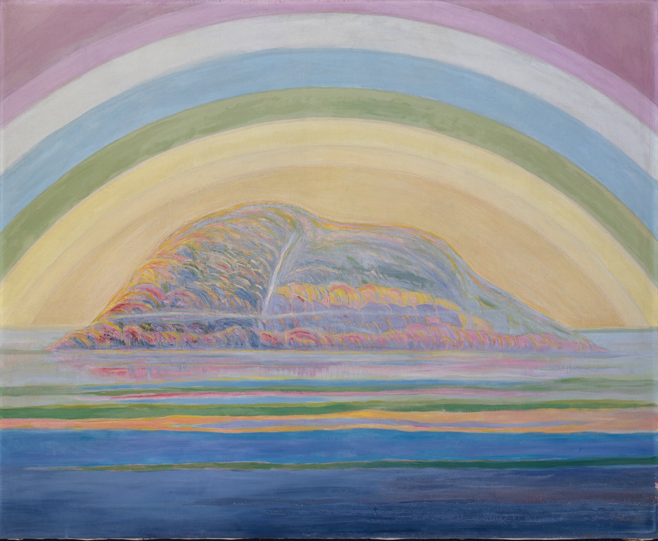 Depuis le XVIIIe siècle, c’est dans la peinture de paysage que tente de s’incarner l’ambition d’une identité nationale helvète. Autour de 1900, dans un contexte où l’approche de la nature se fait subjective et onirique, cette volonté patriotique s’estompe. Le paysage devient un songe, une vision chimérique, un symbole d’harmonie chez des artistes aussi différents que Félix Vallotton, Hans Emmenegger, Alexandre Perrier et Albert Trachsel. Si leurs compositions reposent sur une parfaite connaissance de la nature, ils la transfigurent en usant de couleurs fictives, tout à fait improbables, d’une stylisation de plus en plus poussée des motifs et d’un jeu de variations sur la lumière. En sublimant le paysage dans leur approche symboliste, ils en renouvèlent le genre, plus spécifiquement celui, traditionnel, de la peinture de montagne, en Suisse comme en Europe. Ainsi, entre 1905 et 1913, Trachsel développe un cycle de paysages oniriques auquel appartient « L’île des arbres en fleurs » présentée dans l’exposition. L’irréalité des couleurs et le caractère quelque peu naïf de la composition traduisent l’innocence d’un monde paradisiaque en train de naître sur la toile.