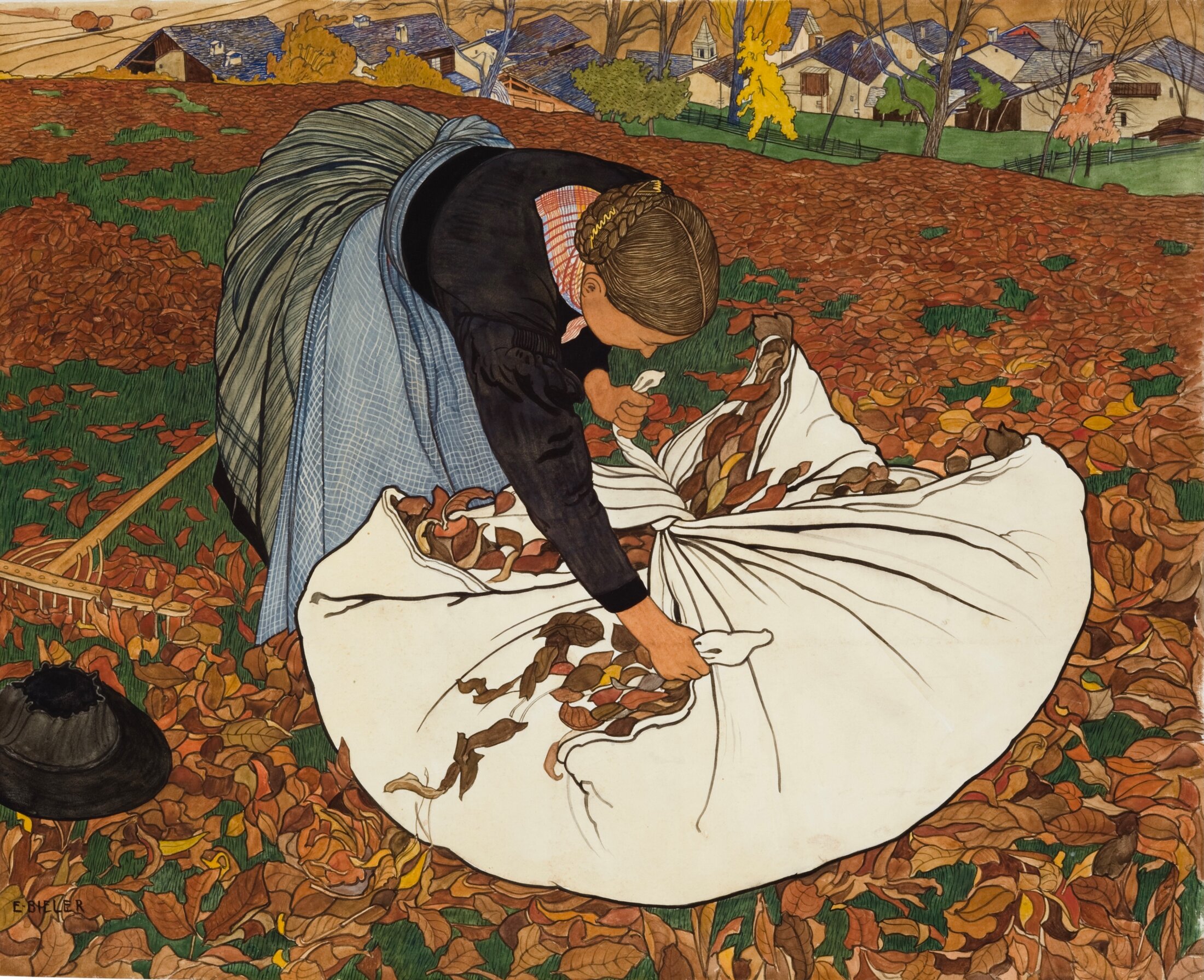 À l’instar de plusieurs mouvements artistiques de la fin du XIXe siècle comme la colonie d’artistes de Worspwede en Allemagne ou l’école de Pont-Aven, certains artistes choisissent de s’installer à la campagne, dans un monde encore préservé de l’industrialisation qui transforme les villes et engendre des bouleversements sociaux. Le village de Savièse dans le canton du Valais attire beaucoup d’artistes au point de les regrouper sous la dénomination de « école de Savièse ». Tous puisent leur inspiration dans les paysages environnants mais aussi dans la vie quotidienne des populations locales dont la représentation, qui passe par les costumes traditionnels, les objets usuels, va fixer une iconographie nationale. Certains, comme Ernest Biéler, se servent de cette production populaire pour créer de véritables motifs à la fois réalistes et imaginaires. Loin de rendre compte du difficile labeur et des conditions de la vie paysanne, Biéler livre, à travers un langage plastique réinventé, débarrassé de l’anecdote, une représentation idéalisée et esthétisante dépourvue de toute critique sociale, à l’image de sa « ramasseuse de feuilles » (vers1906-09, Sion, musée d’art du Valais) dont la stylisation formelle s’inspire de l’Art nouveau. Le cadre rustique illustre le sujet rural.