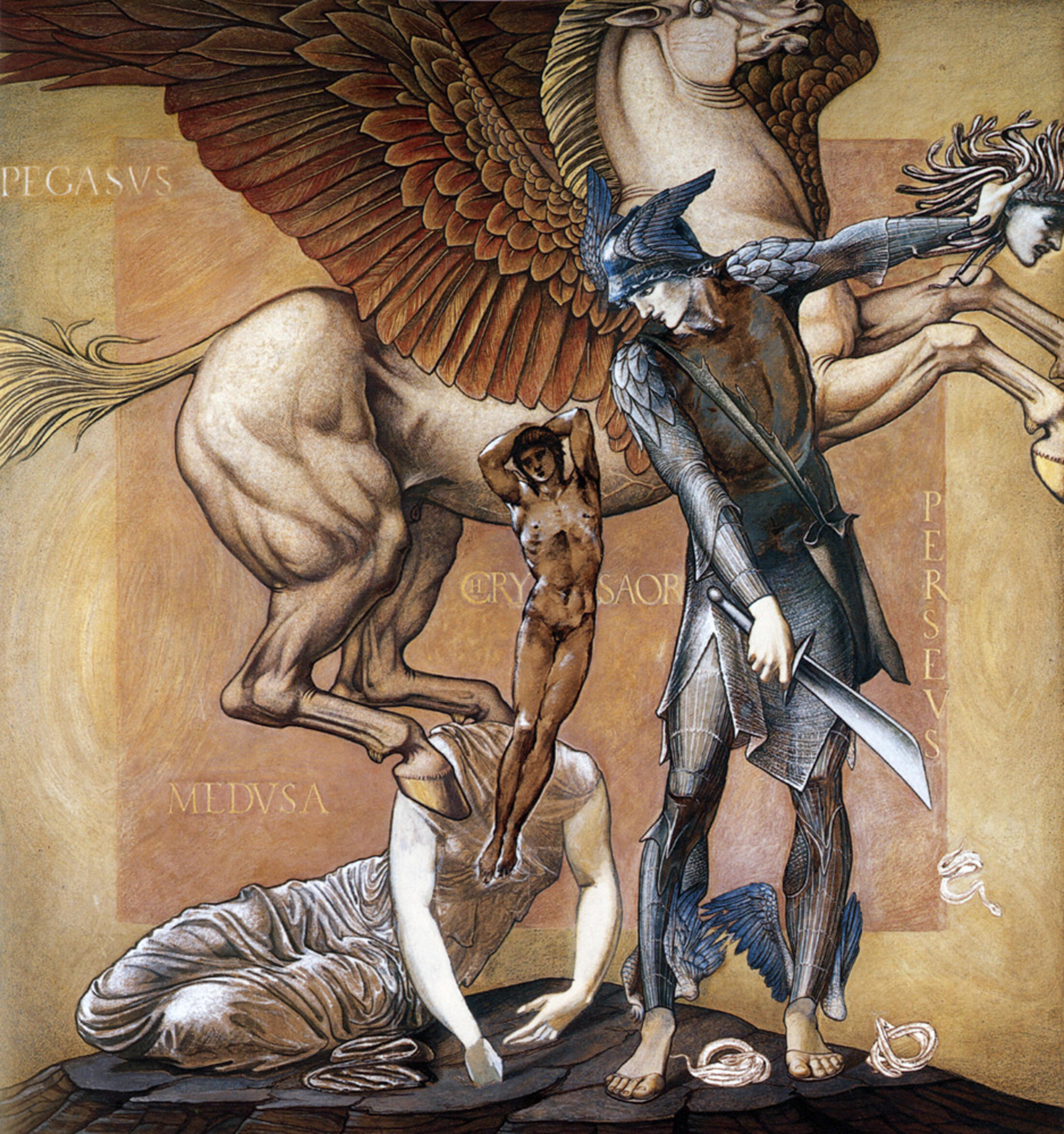 Le projet donne lieu à la réalisation, entre 1877 et 1885, de dix cartons gouachés parmi lesquels « La mort de Méduse » (v. 1882) exposée ici, l’une des compositions les plus frappantes de la série. Le cheval ailé Pégase et le géant Chrysaor, les enfants de son union forcée avec Poséidon, sont figurés sortant du cou tranché de Méduse, libérés lorsque Persée lui frappe la tête. L’armure portée par Persée est une invention assez caractéristique de Burne-Jones qui s’inspire de la sculpture grecque pour façonner l’anatomie soigneusement modelée du cheval et la figure drapée de Méduse.