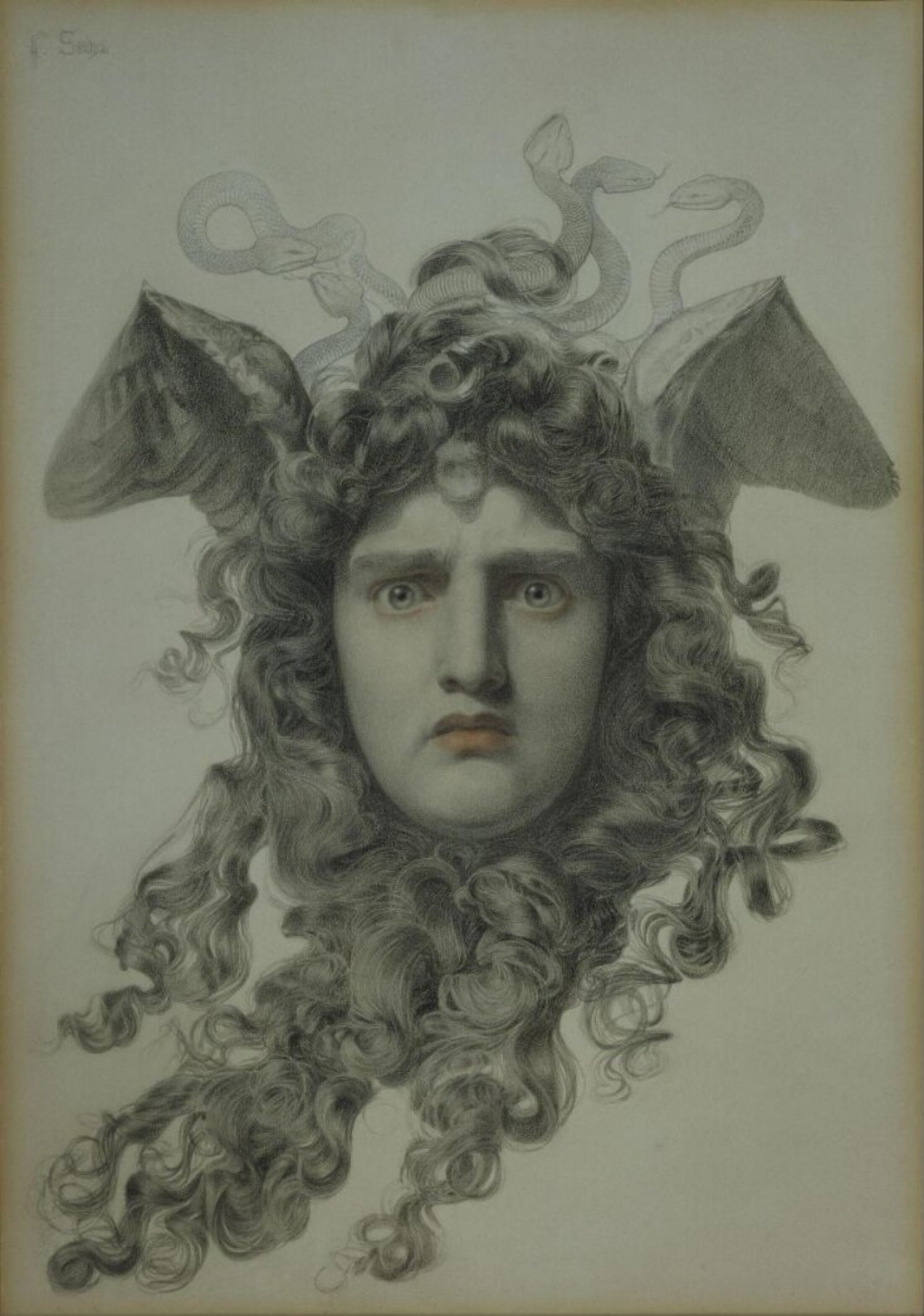 Dans l’Angleterre victorienne, deux conceptions de Méduse s’affrontent, une première portée par ceux qui y voient une manifestation monstrueuse et perverse, parangon de la femme fatale entretenant un rapport névrotique à la sexualité, et une seconde portée par ceux pour qui elle symbolise la figure de l’innocence déchue incarnée par une jeune femme violée puis injustement et atrocement châtiée pour un crime dont elle a été victime. Dans « Medusa » (v. 1875), le peintre préraphaélite Frederick Sandys (1829-1904), réputé pour ses dessins de femmes aux cheveux fluides, fait le lien entre la sexualité dangereuse de la femme fatale et ses cheveux, censés piéger le mâle imprudent.