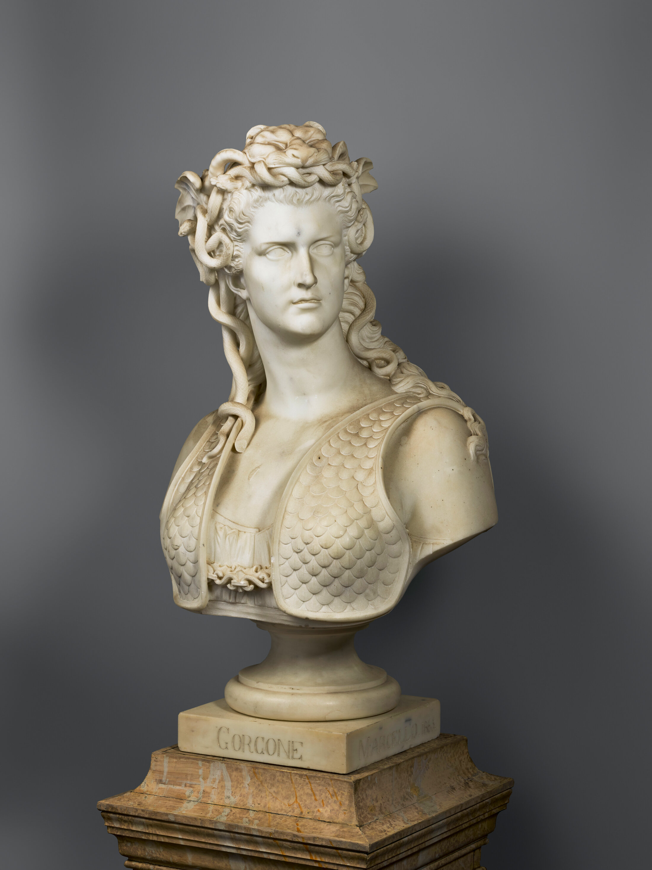 Au XIXème siècle, la figure de Méduse se fait changeante. « La Gorgone » (1864-65) d’Adèle d’Affry[6] dite Marcello – un pseudonyme masculin plus conforme dans un milieu quasi exclusivement composé d’hommes – émane d’une commande pour enrichir la collection personnelle de l’Empereur Napoléon III. Habillée d’un gilet en écailles de serpent et d’une peau de lion, elle laisse paraitre un visage d’aspect acerbe et belliqueux. Une tête de lion domine la couronne de serpents.