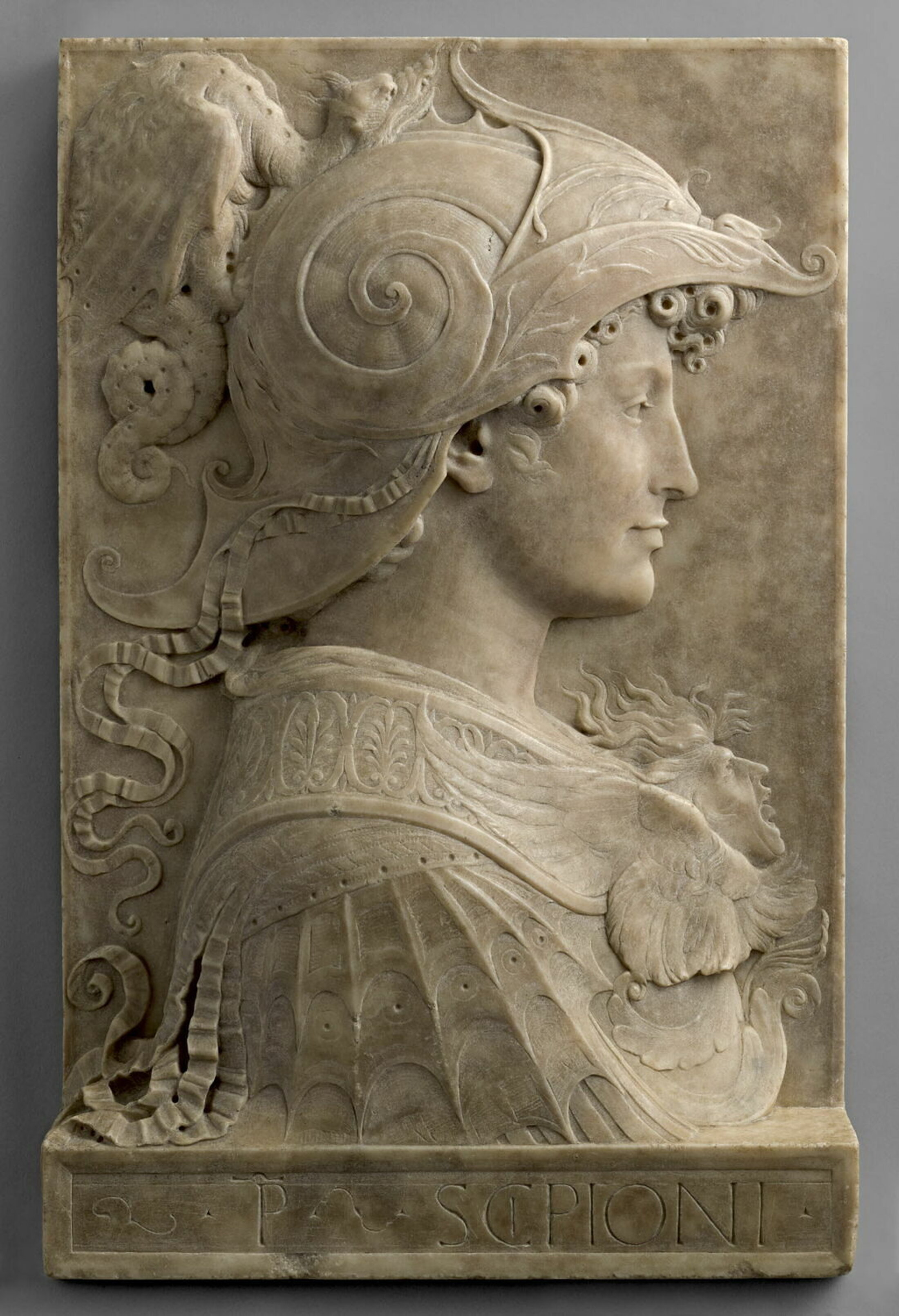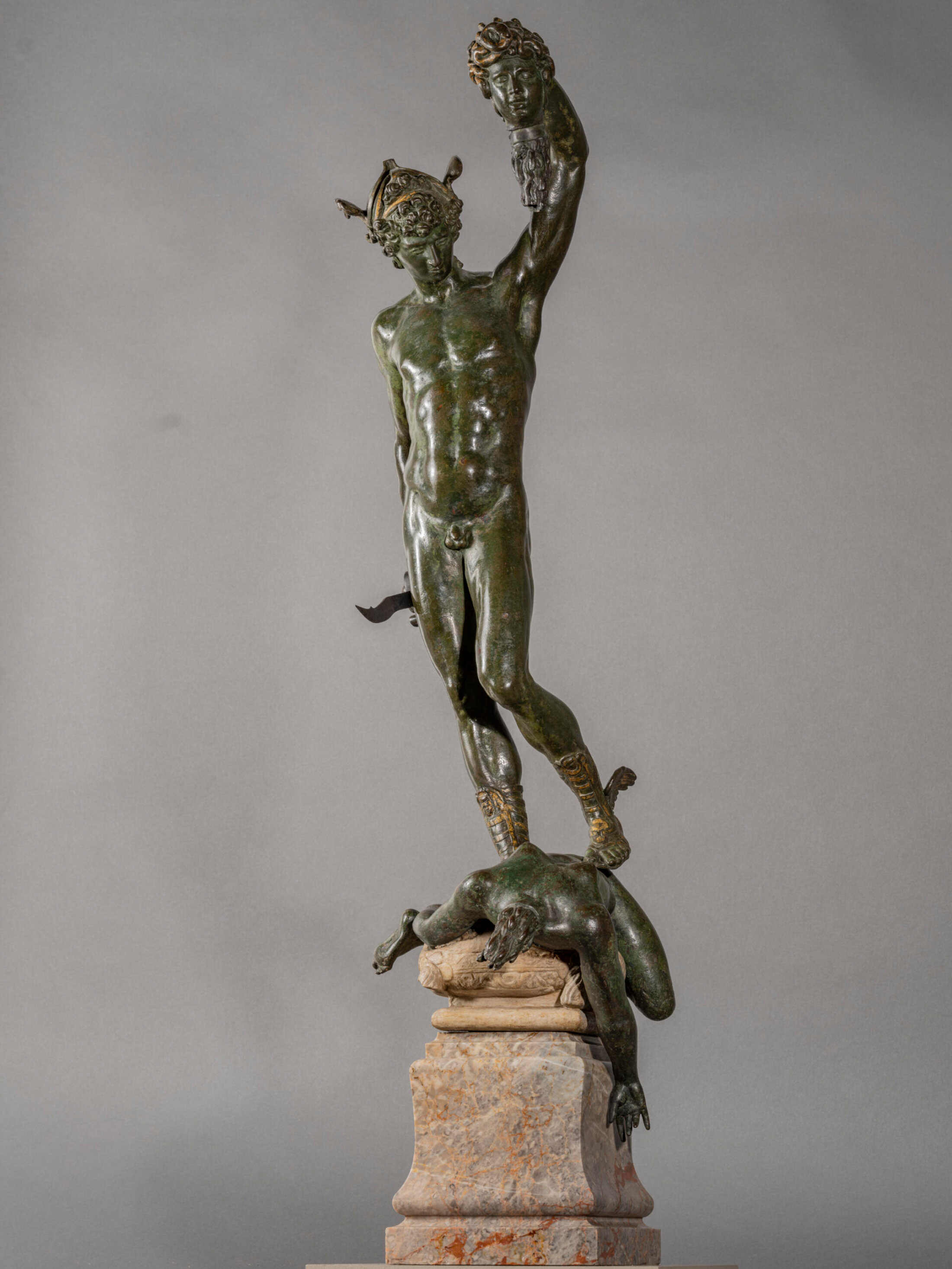 En guise de préambule, l’exposition normande évoque la statue « Persée tenant la tête de Méduse » de la Loggia dei Lanzi à Florence exécutée par Benvenuto Cellini (1500-1571) pour le compte des Médicis à travers son modello, œuvre préparatoire conservée au musée du Bargello à Florence. Cellini, qui a regagné Florence en 1545 après avoir quitté la France, entre au service de Côme Ier de Toscane qui lui commande une statue représentant Persée, spécifiant que celui-ci doit brandir la tête de Méduse dans les airs. L’œuvre a une portée politique. Elle réaffirme le pouvoir de la famille Médicis et sa victoire sur les républicains de Florence qui les avaient expulsés en 1494. Elle doit trouver sa place aux côtés de deux illustres sculptures symboles de la République : le « Judith et Holopherne » (1453-60) de Donatello et l’iconique « David » (1501-04) de Michel-Ange. Neuf années seront nécessaires à son exécution. Il s’agit d’une véritable démonstration de force, une prouesse technique pour l’artiste qui signe ici son premier bronze monumental, réalisé d’un seul tenant selon la technique de la cire perdue[1].