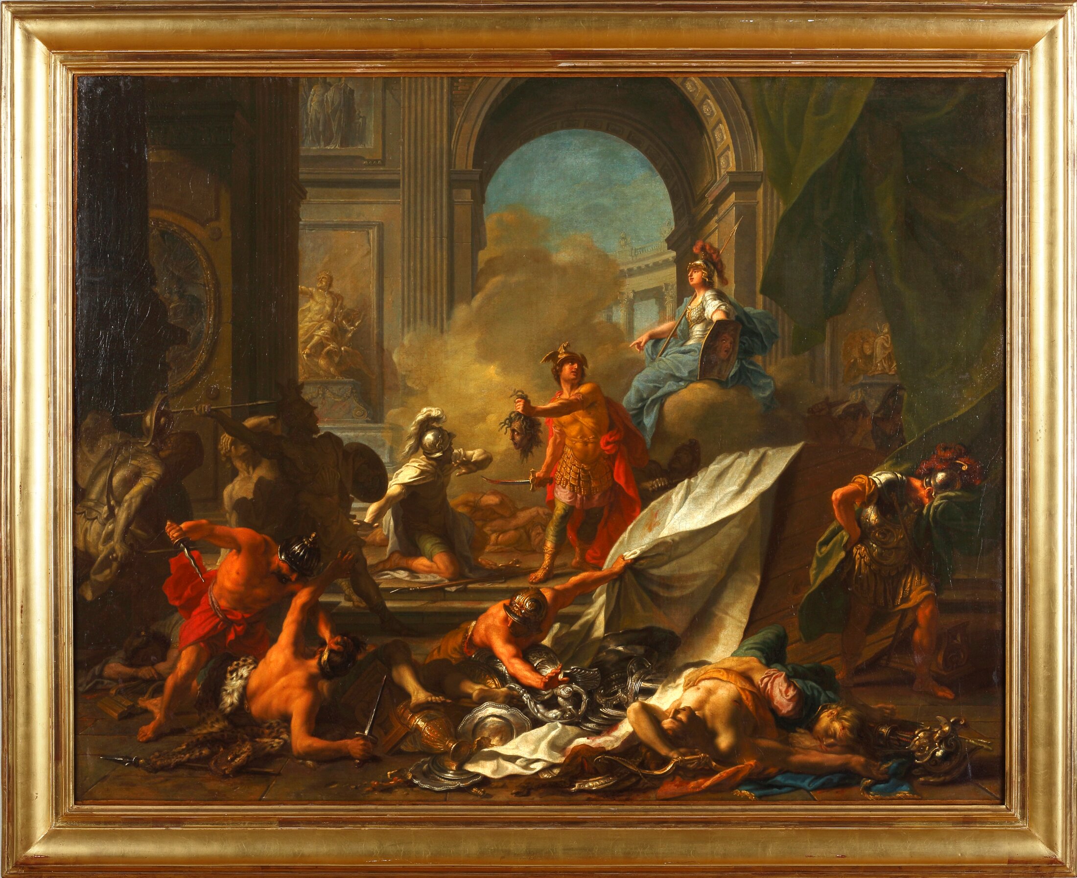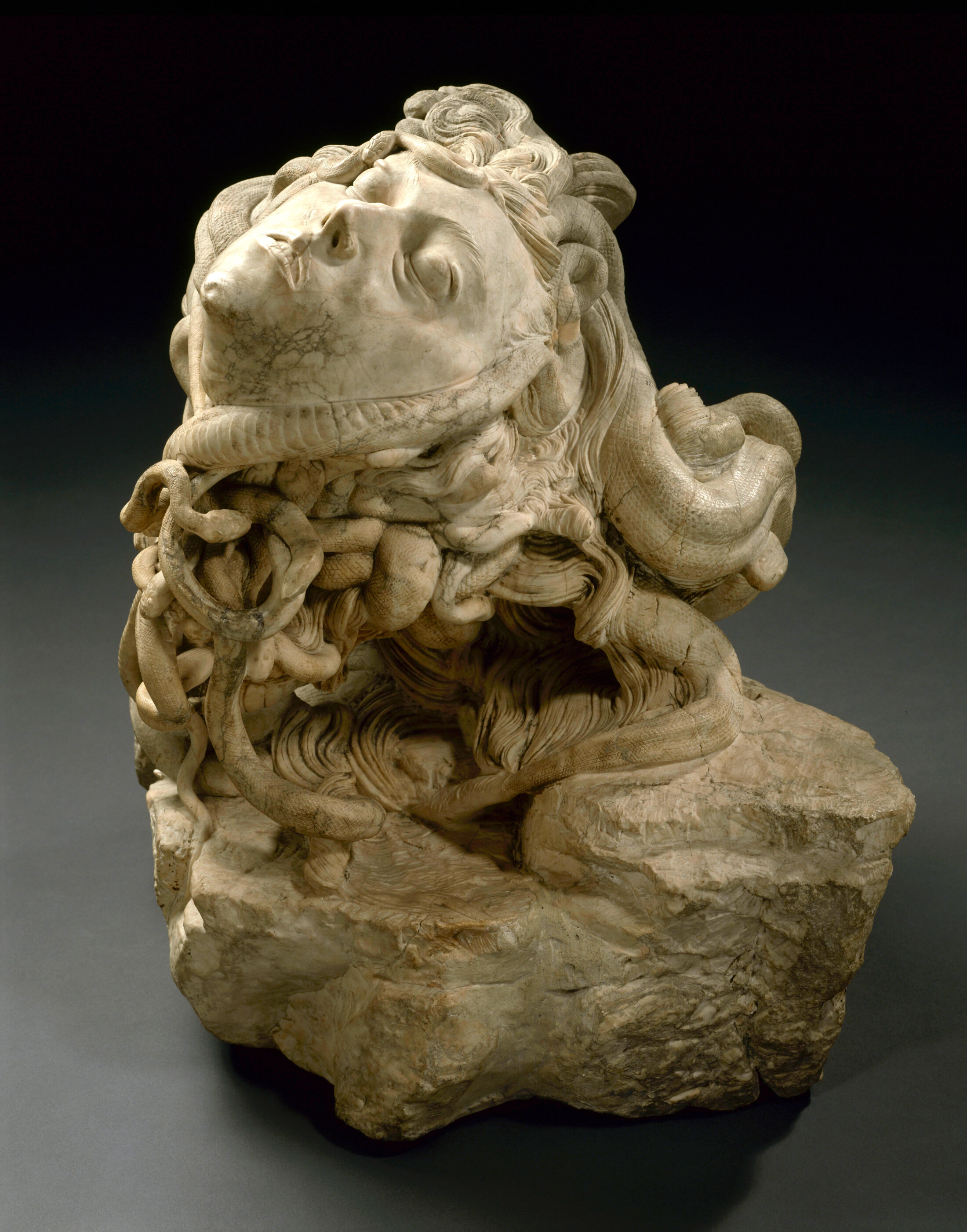 La « Méduse décapitée » (1617-18) de Pierre-Paul Rubens (1577-1640), avec la collaboration de Frans Snyders, prêt exceptionnel du Kunsthistorisches Museum de Vienne, était à l’époque comprise politiquement ou allégoriquement comme un signe de la victoire de la raison stoïcienne sur les ennemis de la vertu. La représentation drastique de Méduse aux grands yeux exorbités et injectés de sang devait provoquer l’épouvante, mettre en scène l’effroi. Chaque goutte de sang qui coule de la tête se transforme en serpent. L’épisode de la pétrification de Phinée est illustré dans un tableau de 1718 à la composition théâtrale de Jean-Marc Nattier (1685-1766) qui n’est autre que son morceau de réception comme peintre d’histoire à l’Académie.