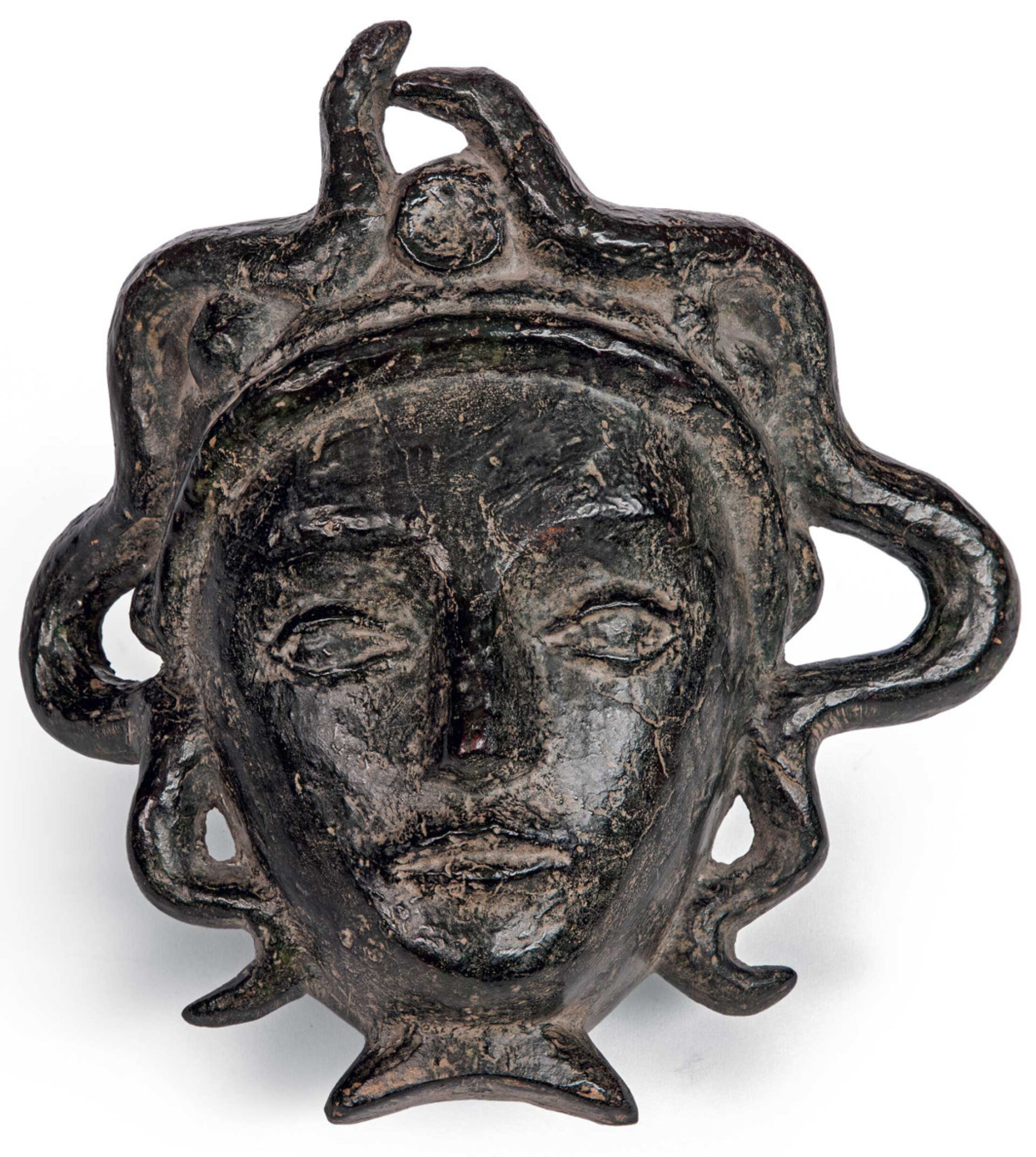 Incarnation de la terreur, la fureur guerrière pour les Grecs, Méduse est attestée dès le VIIème siècle avant notre ère sur le fronton de temples, sur des boucliers, des ustensiles de cuisine. Dans la littérature, elle apparait également au VIIème siècle avant notre ère dans la « Théogonie » d’Hésiode, qui fait le récit de sa décapitation par Persée. Un siècle plus tard, elle est décrite par Homère dans « l’Odyssée » comme un monstre primaire se tenant aux portes de l’Hadès, entre le monde des vivants et celui des morts. Elle est de nature duale, ambivalente. « Elle est partout où il s’agit d’éloigner le mauvais sort, ou son caractère d’épouvante est censé repousser l’épouvantable[2] » écrit Jean-Pierre Vernant dans « La mort dans les yeux ». Face ronde, mi-animale, mi-féminine, mi-masculine, yeux écarquillés, bouche grande ouverte, barbue, Méduse se joue de la norme et de la marge. Elle incarne autant « l’horreur du terrifiant que le risible du grotesque[3] ».