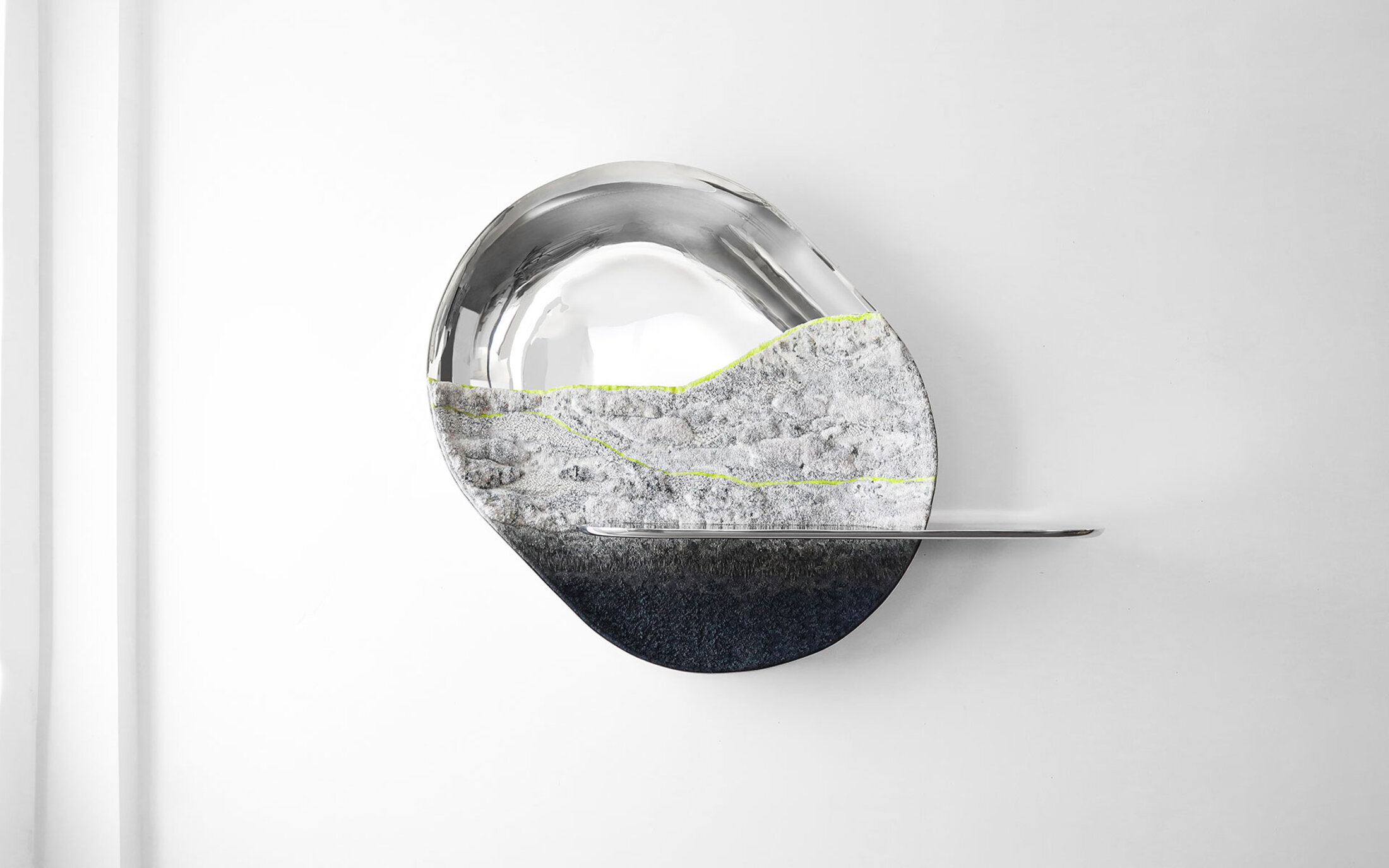 Forme de partenariat public-privé, l’édition déléguée engage la Cité avec une galerie en charge de concevoir et de commercialiser une collection de multiples dont les prototypes sont destinés à entrer dans la collection. Conçue pat le Studio Valérie Maltaverne – premier à collaborer avec la Cité dans ce cadre –, la collection « The great Lady » comprend sept pièces de mobilier intégrant des tissages en tapisserie d’Aubusson. Normalement garniture, elle devient ici une structure. Les lissiers ont dû dépasser leur savoir-faire, du moins en explorer les limites pour proposer des textures inédites, inventer un nouveau traitement, bien loin de celui d’une tapisserie ordinaire à plat. Ainsi, « Le troupeau » (2019), banc brûlé[7] oscillant entre objet fonctionnel et sculpture, enchâsse une tapisserie qui sert d’assise. Le tissage devient peu à peu un élément organique du bois brûlé, un seul corps, inextricable, indissociable. « Paysage polaire » s’inspire de l’image d’un paysage se reflétant dans un lac. La console murale repose sur un plateau légèrement bombé en aluminium poli miroir, partiellement recouvert d’une tapisserie qui apporte textures et volumes nécessaires à la figuration des reliefs du paysage. « Tout l’enjeu de ce projet réside dans le fait de devoir retranscrire des impressions visuelles pour la plupart empruntées à la nature, en une interprétation textile où la tapisserie doit se faire tour à tour mousses, lichens, roche…[8] » résume parfaitement la lissière Catherine Bernet. Pour retranscrire au mieux ces impressions sensorielles, elle associe au point plat d’Aubusson plusieurs techniques de point noué, traditionnellement réservées à la fabrication de tapis de savonnerie.