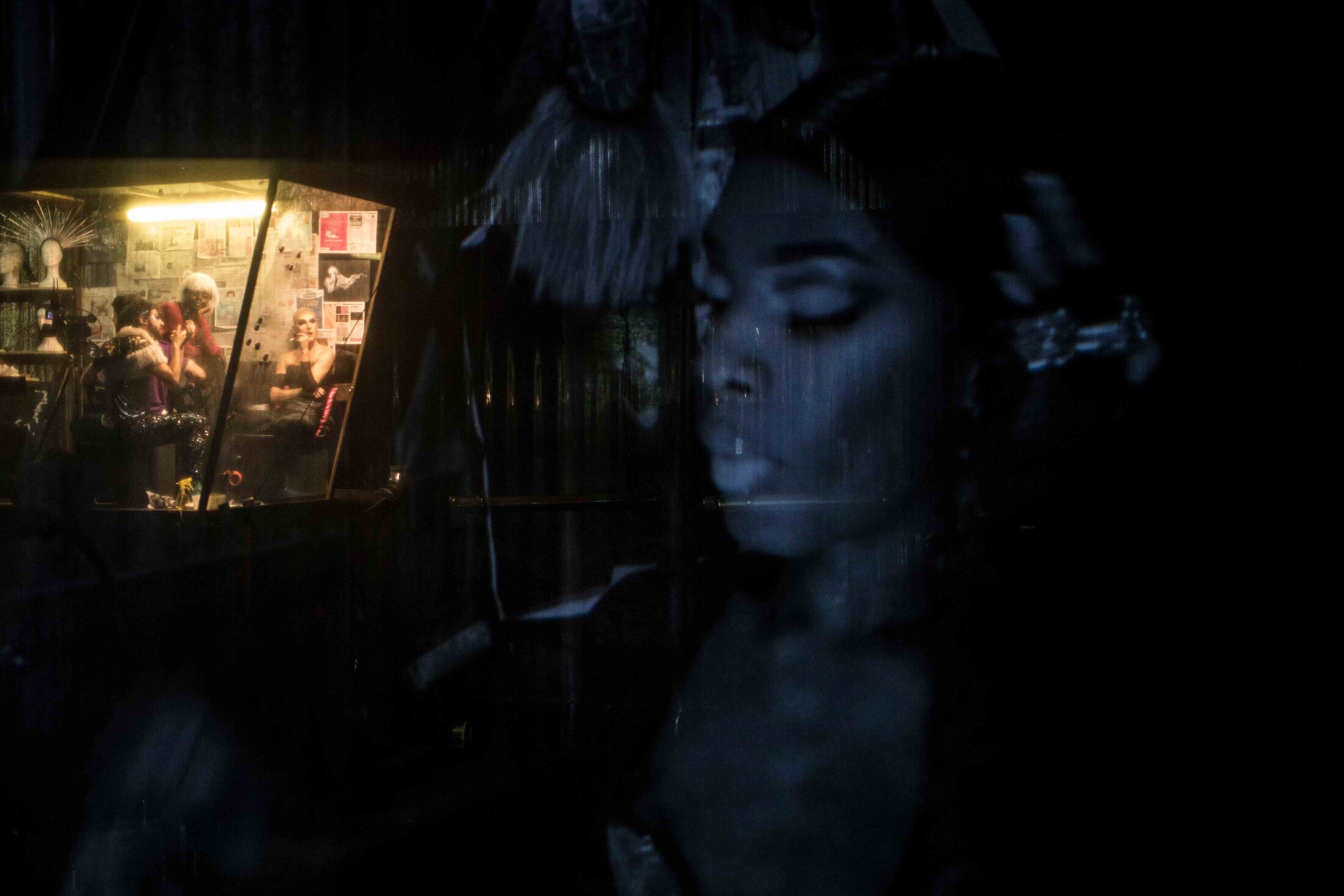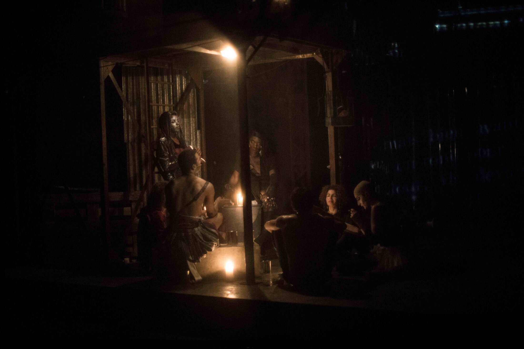 Le deuxième temps se situe dans un futur suffisamment proche pour garder la mémoire du premier dans les ruines de l’usine, et en même temps, suffisamment éloigné pour que les protagonistes de la nouvelle occupation n’aient connu le territoire que par les livres d’histoire. Dans les restes de l’ancienne usine à l'atmosphère onirique, presque irréelle, se dresse le Nickel Bar, lieu de rendez-vous d'une communauté interlope. Mathilde Delahaye s'inspire du scénario de « Nickel stuff » de Bernard-Marie Koltès, décrivant une communauté de danseurs afro-américains dans un club situé en périphérie de ville. Dans ces scènes polyphoniques pensées par la metteuse en scène « comme des tableaux parlés, chantés dansés », les récits de vies marginales se racontent à travers les corps minoritaires des personnages, performées dans des battles de danse qui sont autant de rituels exutoires. La cabane, élément rassurant parce que familier, issu de l’enfance qui reste dans la plupart des cas le monde d’avant la discrimination, cocon et refuge, est l'espace commun, le lieu de rassemblement. Érigée en hauteur, dans un coin du hall central de l’ancien bâtiment industriel, à la marge cependant avec cette différence désormais : elle participe du retour à la vie, on y entend des éclats de rire, des chants, on y coud les habits de bataille qui seront portés lors des bals. Elle s’impose comme un havre lumineux exprimant une certaine plénitude après les affres d’une adolescence souvent passée dans la rue, loin de la famille biologique qui l'a rejetée. La cabane est la métaphore poétique de la renaissance dans le lieu même du désastre. Elle est la caverne, la matrice, le ventre maternel, le lieu où rien ne peut arriver. Cet espace névralgique est celui de la famille que l’on se choisit en entrant dans la communauté du voguing. Car celle-ci se compose bien de familles, chacune regroupant une dizaine de personnes, les « Houses », dirigées par une « Mother » et un « Father » veillant sur leur « kids ». Elles jouent un rôle social fondamental d'éducation et de protection pour ces jeunes en situation précaire, leur offrant les conditions nécessaires pour réinventer leur vie. Née aux Etats-Unis, de la double exclusion de la communauté homosexuelle et de la communauté afro américaine, le mouvement est connue du grand public pour son invention d’un style spécifique de danse urbaine, lorsque celui-ci sera popularisé par Madonna bien plus tard, mais qui à l’origine exprime un cri éminemment politique, puisqu’il s’agissait de dénoncer le racisme de la société américaine en parodiant les concours de beauté de l'élite blanche dont les corps noirs étaient exclus, puis en reprenant en les exagérant les poses des mannequins blancs figurant dans les grands magazines de mode américains, dont le plus célèbre d’entre eux, « Vogue », qui donne son nom au mouvement, incarnait l'argent, le luxe, la richesse, tout ce qui était alors interdit à cette communauté. Les bals, soirées organisées dans des ballrooms, deviennent des manifestes, des réponses à leur exclusion, y compris des communautés blanches LGBT+. Devenir l'icône, le modèle le temps d'une soirée, se maquiller à l'excès, porter des costumes chatoyants, des talons aiguilles démesurés, s'inventer soi-même, être libre, enfin. En France, la naissance des communautés de voguing, il y a un peu plus de dix ans, répondait aux mêmes désirs, adaptés au contexte sociopolitique local.