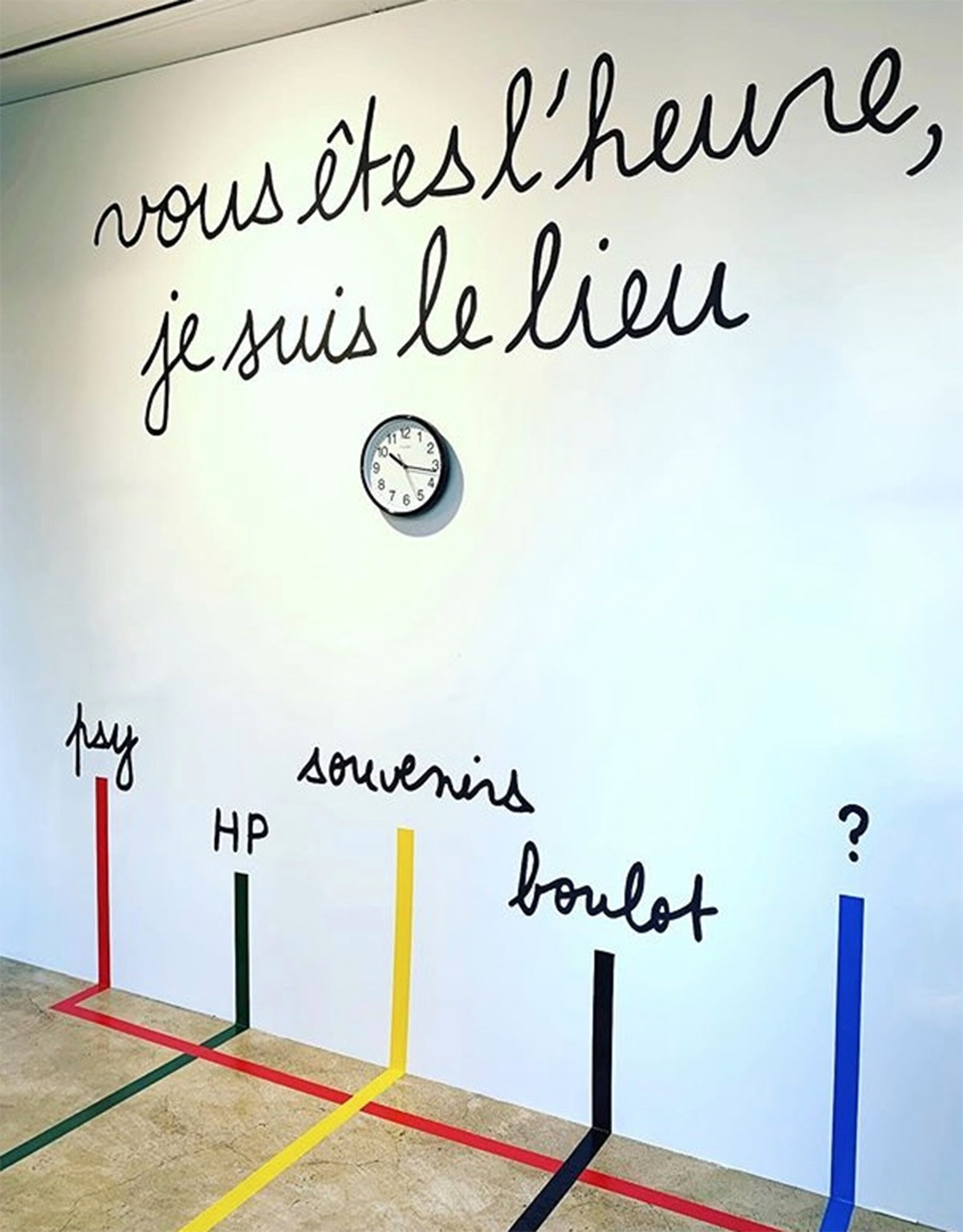 A l’entrée de la maison des arts, les bandes colorées qui partent du mur pour rejoindre le sol, inspirées de la signalétique que l’on trouve dans certaines chaines de magasins de bricolage comme dans les hôpitaux, dessinent autant de chemins que le visiteur est invité à emprunter. Cette présentation de prime abord ludique, combinant teintes éclatantes et légèreté formelle, interroge la condition humaine actuelle à l'aune des inquiétudes contemporaines qui réduisent la vie à un labyrinthe sinueux, un long fleuve intranquille :