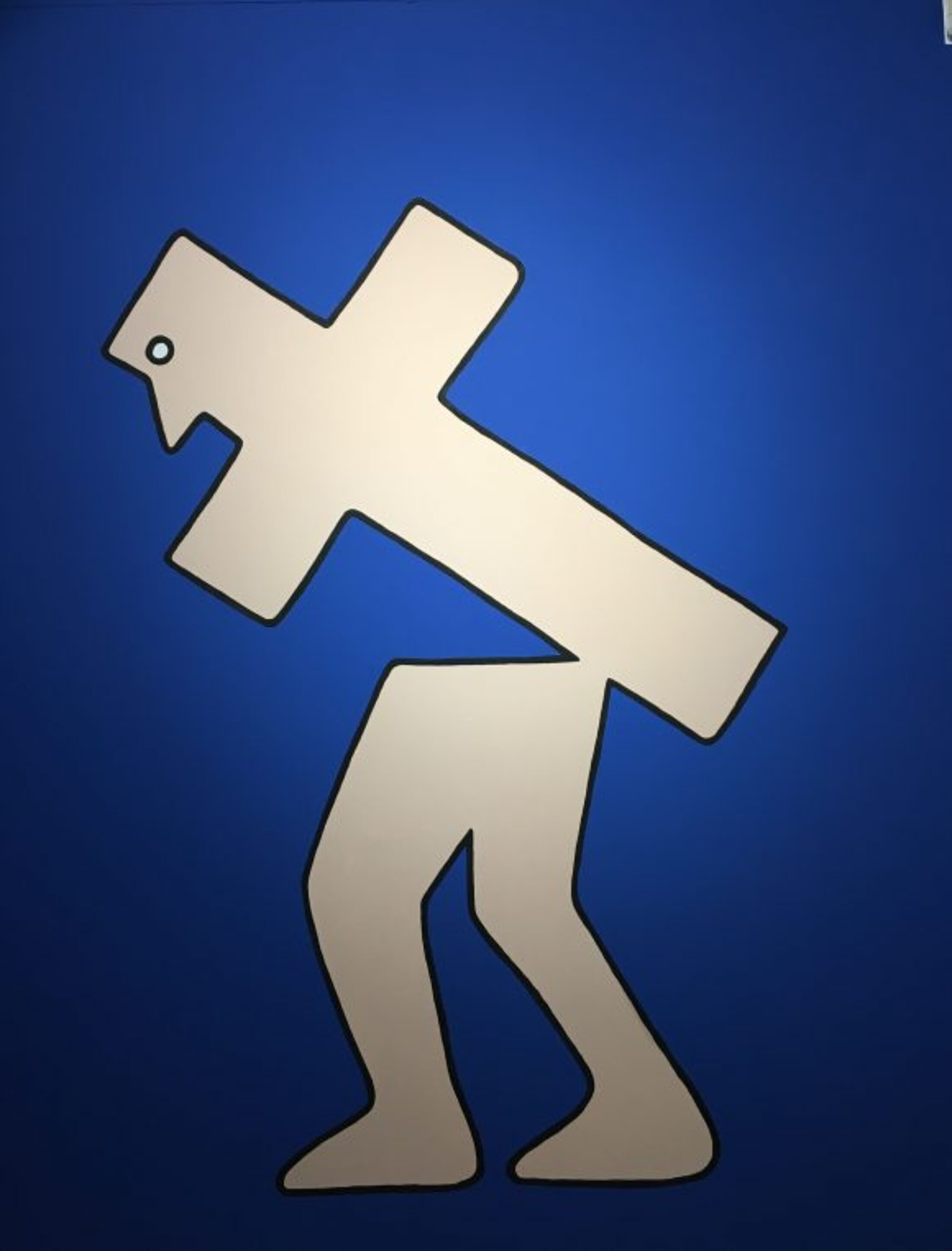 - la ligne bleue, symbolisée par la ponctuation ? transporte jusqu'au « Gros câlin » à l’étage, film dans lequel Louise Pressager, travestie en Jésus, se retrouve aux prises avec un second personnage enserré dans un costume de croix marron. Le film court n'est ni docte, ni iconoclaste. La croix dépasse la représentation religieuse pour incarner une allégorie de la souffrance humaine. Louise Pressager interroge ici le rapport qu’entretient l’individu à sa propre douleur et envisage l’artiste, sa souffrance et son œuvre comme une nouvelle trinité à la consubstantialité réversible.