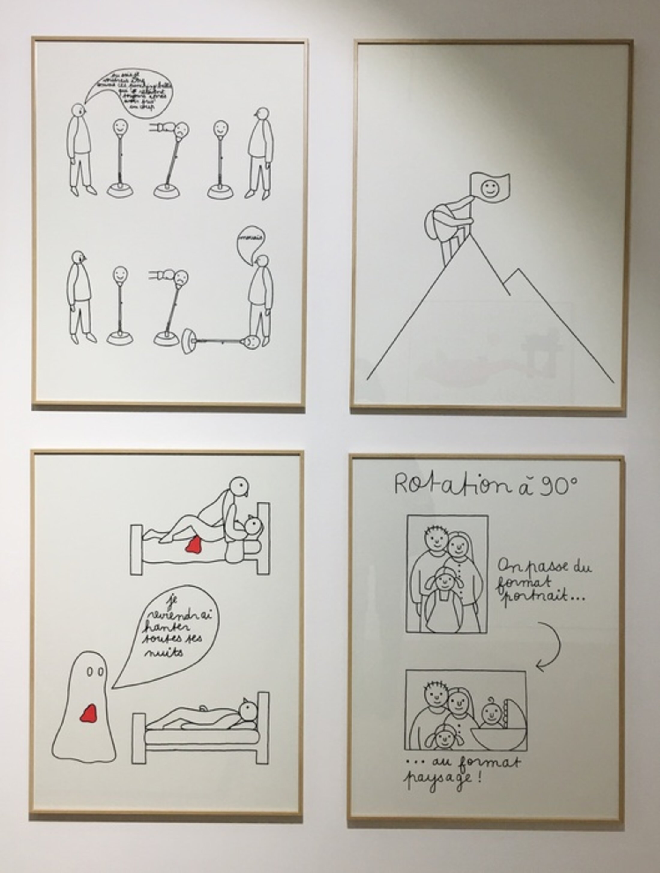 - la ligne verte qui conduit à l’HP, laisse découvrir au détour d’un mur, un amoncellement d’images et d’objets répartis en trois étagères sur lesquelles il est inscrit respectivement : causes, symptômes, traitements. Des dessins, disposés en frise au-dessus des rayonnages, déclinent les différents états psychologiques rencontrés, tandis que le film muet « Ca va mieux » esquisse de façon métaphorique et quelque peu humoristique, les grands enjeux de l’hospitalisation en milieu psychiatrique. Les protagonistes incarnent une pathologie ou une entité en lien avec ce milieu : la névrose au pyjama bleu trop petit et à l’entonnoir sur la tête, la santé avec son gyrophare sur le nez, des étoiles sur lunettes, des cheveux bleus et un blouse blanche, la psychose, malade en pyjama bleu trop grand, la famille, vêtue d’une robe à motif de brique et d’une coiffe en forme de toit de maison, la religion en costume de croix brun et enfin la mort au visage grimé de blanc, à la bouche cousue, portant collant noir et chaussée d’une paire de rollers. Le film est découpé en chapitres dont le premier met en action deux groupes : santé, famille d’un côté, mort et religion de l’autre. Tout d'un coup, la névrose se met à courir, boulet au pied, en direction de la mort et la religion. Une sirène d’ambulance retentit lorsque santé et famille parviennent in extremis à extirper le patient des griffes de la nuit. Elles ont remporté la premier round.