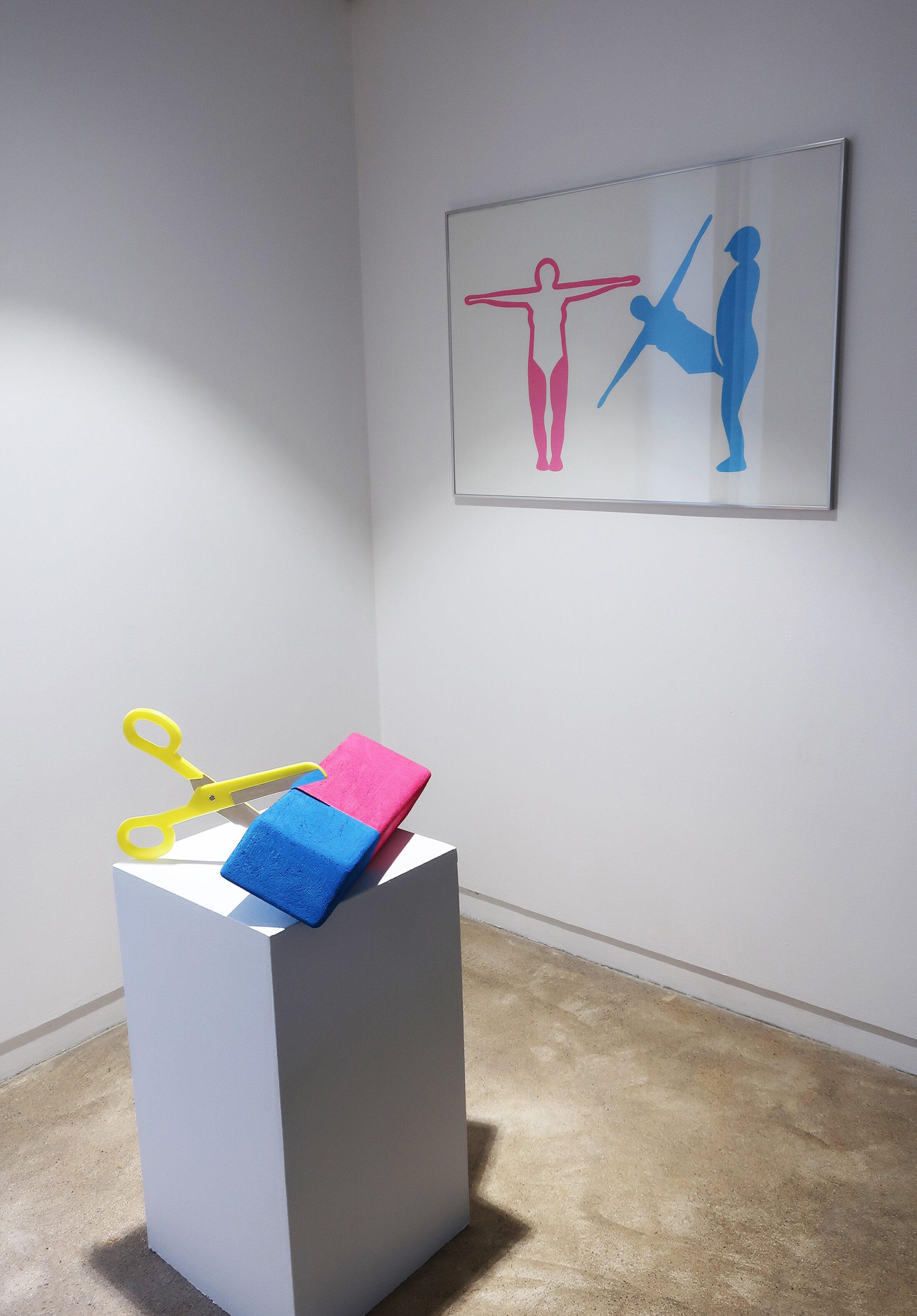 Louise Pressager est une femme qui tombe et se relève. Sa grande force se trouve là, précisément dans cette capacité à chuter et à toujours se redresser. Super héroïne profondément ancrée dans son temps, elle possède cette fragilité hésitante qui trahit l'angoisse d'un futur incertain à une période qui, à bien des égards, annonce la fin du monde dans lequel nous évoluons et le basculement dans une nouvelle ère dont les modèles sociétaux devront inéluctablement redéfinir la place de l'humanité parmi le vivant à travers la réinvention de ses interactions avec son environnement. Les soubresauts ultra-conservateurs qui secouent actuellement le monde occidental apparaissent comme les dernières tentatives de sauvegarde d'un système à bout de souffle. Avec son sourire inquiet et son humour à contre-temps, Louise Pressager s'inscrit à l'exact opposé de la force triomphante des « working girls » des années quatre-vingt, femmes d’affaires invincibles aux brushings parfaits, aux épaulettes impeccables, forcement mères de famille modèles. Cette construction fantasmée de « super women » sans faille a sa part de responsabilité dans l'état d'insécurité actuel. La double injonction faite aux femmes de réussir parfaitement leur vie professionnelle, tout en conservant leur rôle de figure tutélaire de la famille, revient comme un boomerang trente ans plus tard. Au sol, les bandes colorées supposées ludiques sont autant d’itinéraires escarpés qui reflètent l’univers mental de l’artiste. Son paysage intérieur redessine les salles du centre d’art. La proximité familière qui s'en dégage tient de ce que les peurs intérieures de Louise Pressager sont les miroirs des affres de la vie actuelle. Ils nous renvoient à une schizophrénie contemporaine qui se manifeste inconsciemment lorsque nous sommes placés face aux injonctions contradictoires du quotidien, lorsqu’on nous demande, par exemple, d’être spontané tout en faisant preuve de self-contrôle, ou bien d’innover dans le respect des règles, ou encore quand on nous ordonne : « Ne faites pas ce que je dis ».. Ainsi, chaque jour, Louise Pressager nous rappelle que le travail n’est plus une valeur d’épanouissement. Son expérience en open space en fait le lieu anxiogène par excellence :