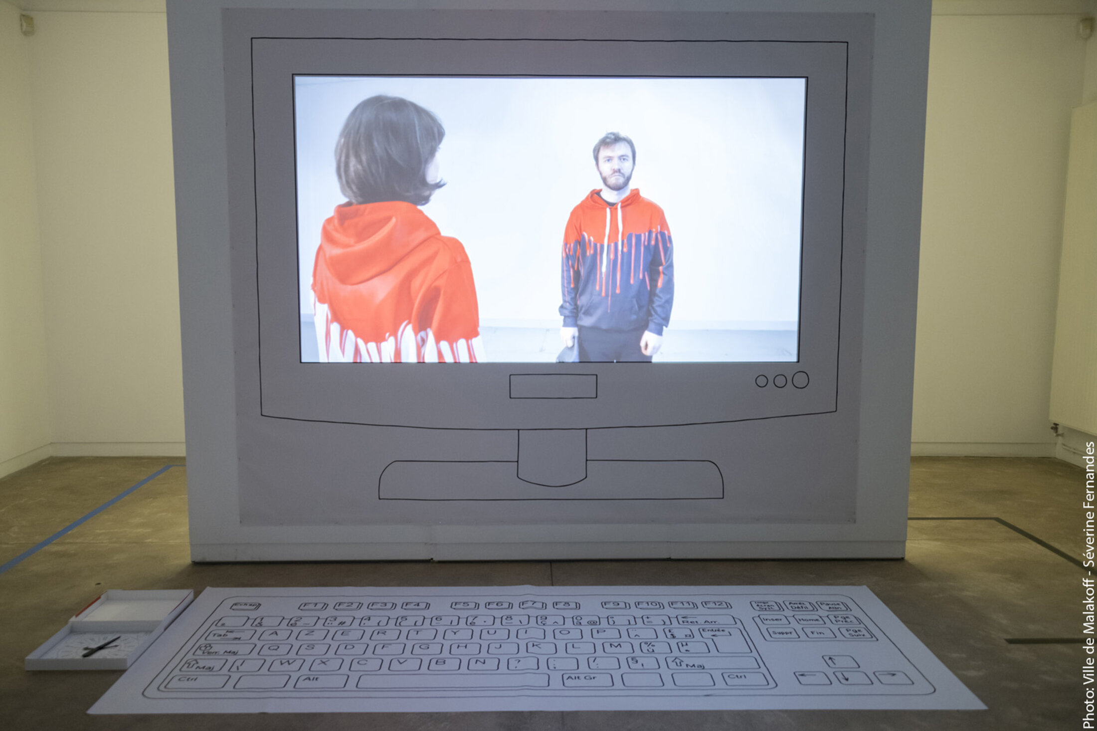 - la ligne jaune est celle des souvenirs dont le sol change de texture et d'aspect. Au lino bleu aquatique façon David Hockney renvoie à la douceur apaisante d'une piscine répond un faux gazon sur lequel sont disposées trois chaises invitant à l’assise. Le mur de gauche accueille, à la manière d'un trophée de chasse, une bouée crevée figurant un canard, reliée à une pompe. Installé sur le mur du fond, en surplomb de la fausse piscine, un écran diffuse un clip dans lequel se croisent quatre personnages au genre incertain, oscillant entre masculin et féminin. Le décor de carton-pâte donne vie aux souvenirs d’une bonne élève qui osera entonner « je crois que j’oserai te dire je t’aime ».