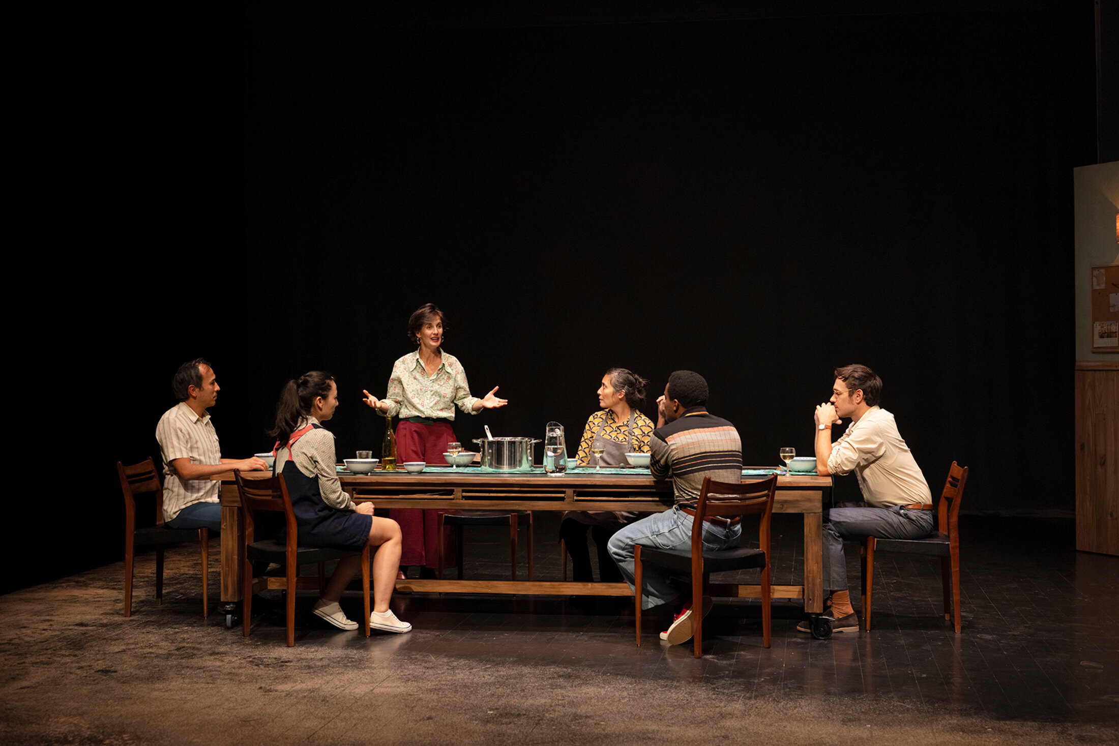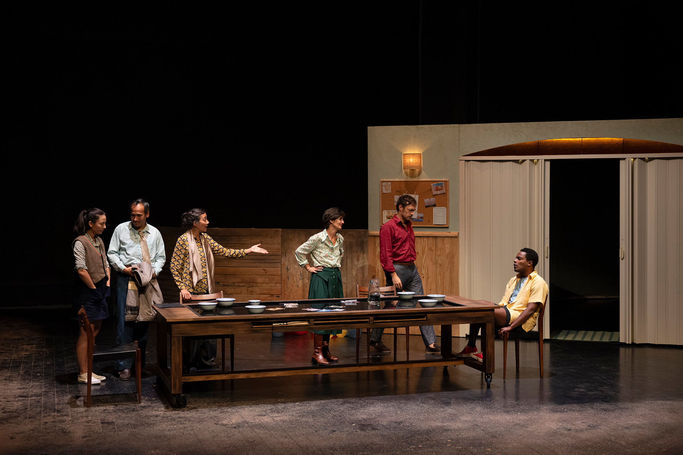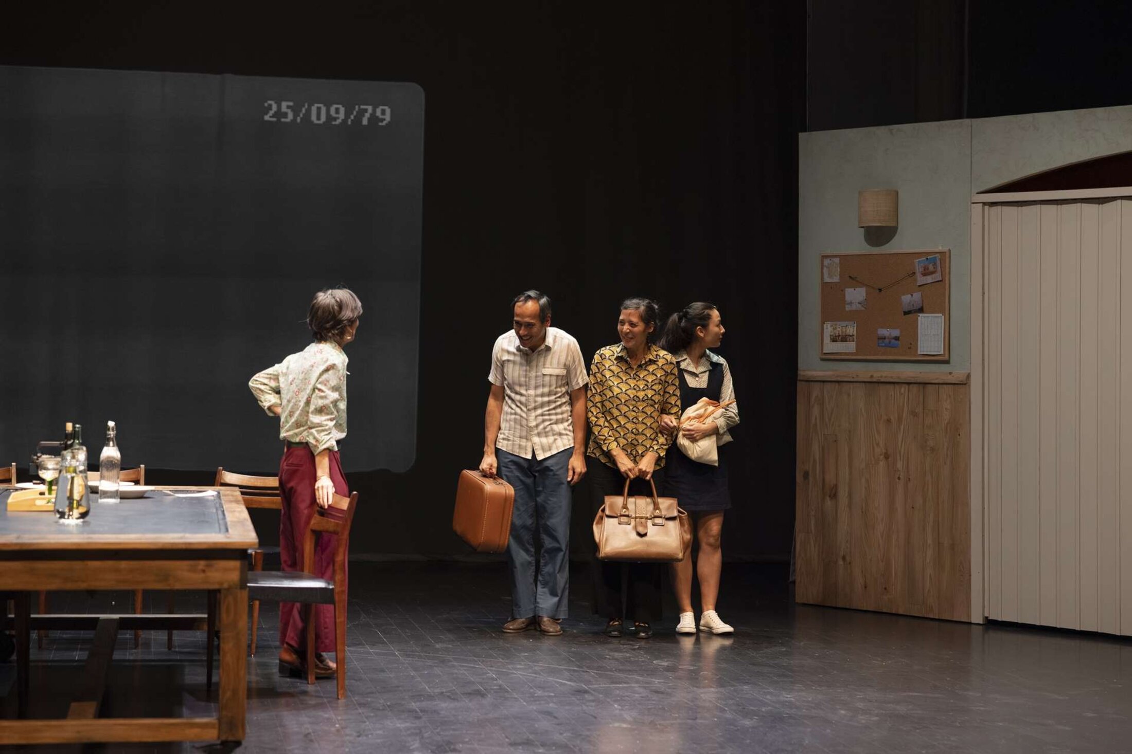 L’efficacité de la mise en scène réside dans son économie de moyens. Un plateau nu, à l’exception d’une grande table et de quelques éléments utilitaires qui servent de palimpseste, se transformant de cale de bateau en cuisine, de salle d’attente en chambre à coucher, devient le théâtre des possibles. Pas d’effets spectaculaires, la tempête n’est pas artificielle mais intérieure. L’économie de décor est assumée comme politique, évitant l’illustration pittoresque au profit d’une matérialité signifiante. Les jeux de lumière, parfois abrupts, cisèlent l’attention, quand la présence persistante du son travaille comme une ligne de force, maintenant la tension entre le huis clos et l’immensité menaçante de la mer. La metteuse en scène orchestre cette tension entre l’intime et le collectif, rappelant que le théâtre est ce lieu dans lequel l'histoire des nations se réécrit par les corps. Fresque polyphonique répondant à une urgence contemporaine, la pièce est ancrée dans la politique du quotidien. Ici, l’accueil n'est pas une abstraction humanitaire, mais un frottement concret, à l’image des leçons de français balbutiées sur fond de disques de Joe Dassin. La pièce interroge sans complaisance la France des années soixante-dix, nation postcoloniale qui, sous couvert de générosité, masquait ses propres blessures d’Indochine. Loin de la leçon moralisatrice, Bachelot Nguyen infuse à son texte une poésie saline, presque lyrique, dans des monologues où la langue vietnamienne s'entremêle au français, créant un idiome hybride qui fait écho à la créolisation des identités. La scénographie de Kim Lan Nguyen Thi, minimaliste et évocatrice, avec ses projections d'ondes marines stylisées, amplifie cette hybridité. Le plateau oscille entre salon bourgeois et pont de fortune, un limbe où les cultures se heurtent et se fondent.