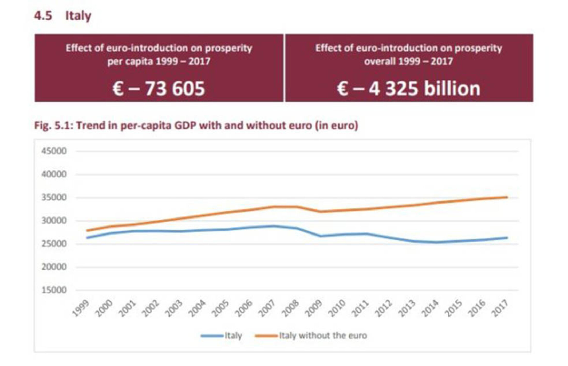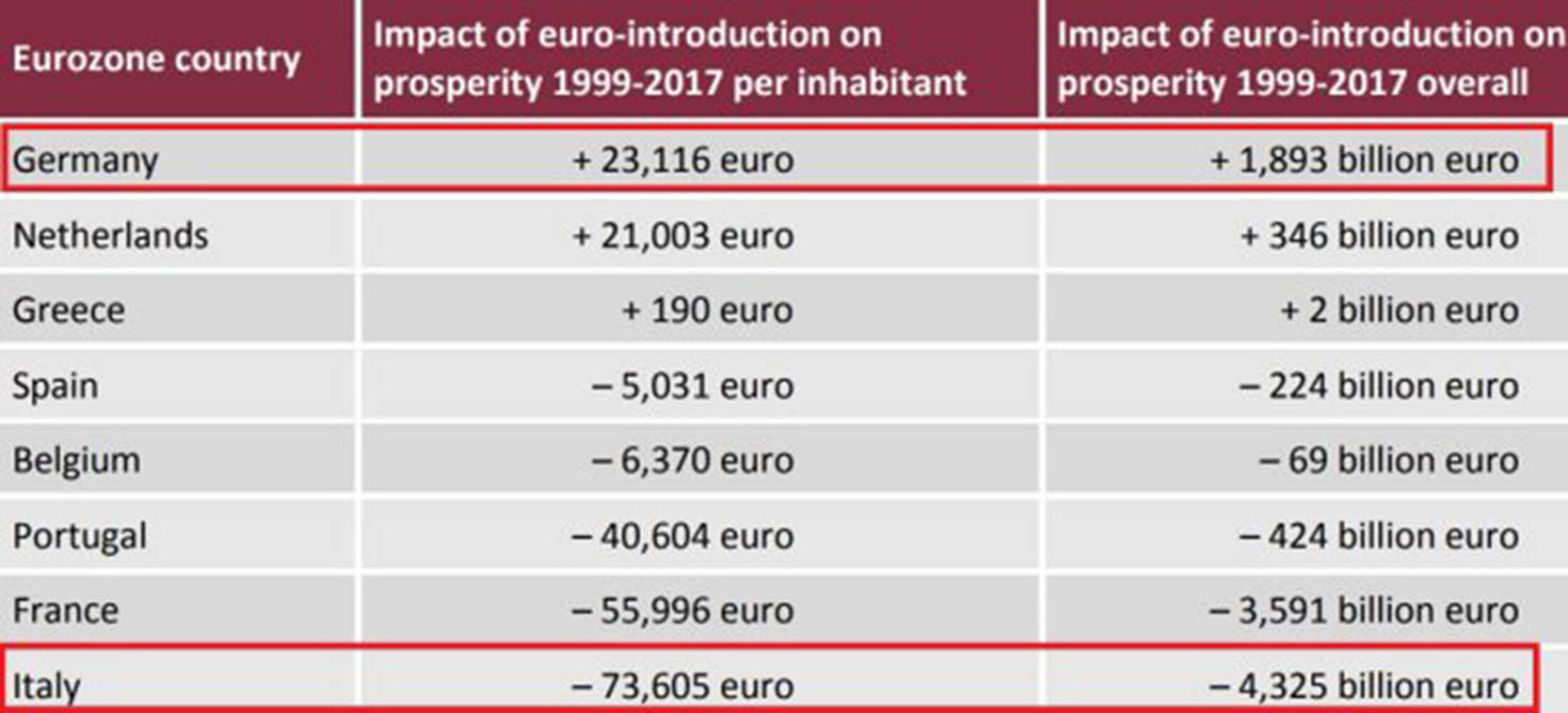 Commence ensuite la liste des perdants. Si l'Espagne et la Belgique n'ont pas trop vu baisser leur PIB par habitant (-5031 et -6370 euros), les Portugais ont plus fortement souffert de la monnaie unique (-40.604 euros par personne). Et les deux pays les plus négativement affectés sont la France et l'Italie, qui ont perdu respectivement 3591 et 4325 milliards d'euros sur 20 ans, soit 55.996 euros par Français et 73.605 euros par Italien. Le bilan global semble donc, à l'échelle de l'économie européenne, plutôt négatif.