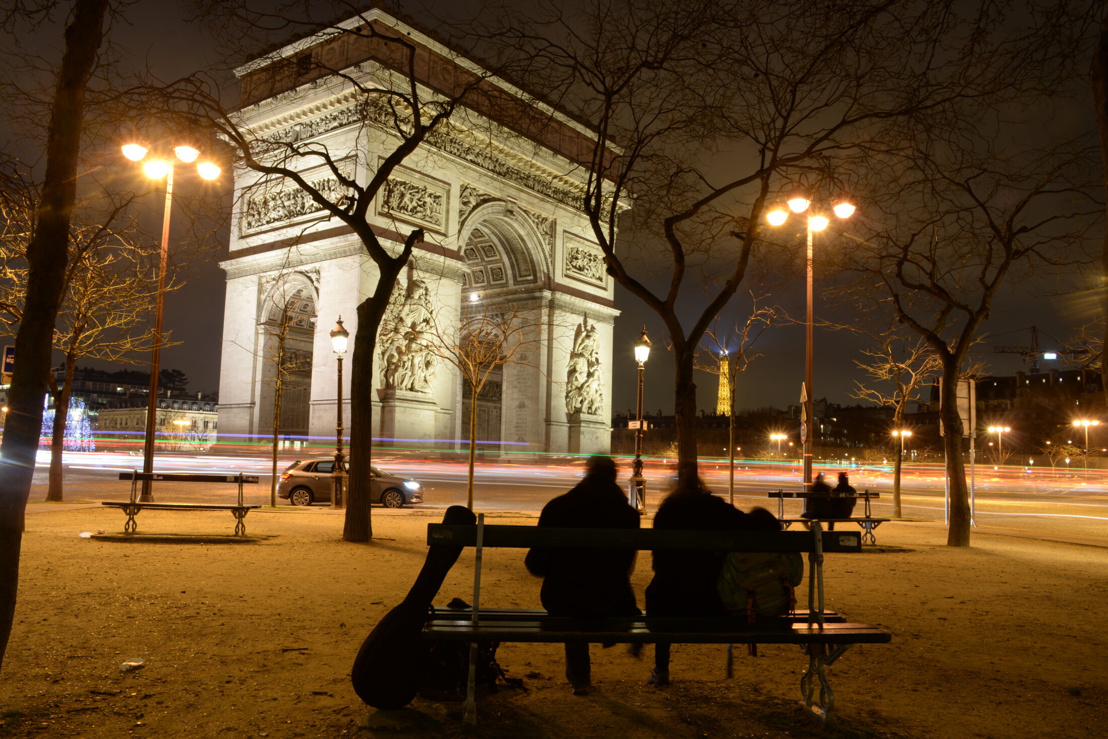 Acariciando París, con sus pies, sus maquinas y objetivos buscan en la noche silenciosa, con la brisa de invierno, escudriñan los monumentos que viven de noche, iluminados arbitrariamente por las autoridades. Cada calle y monumento los llama, para que observen su belleza nocturna.