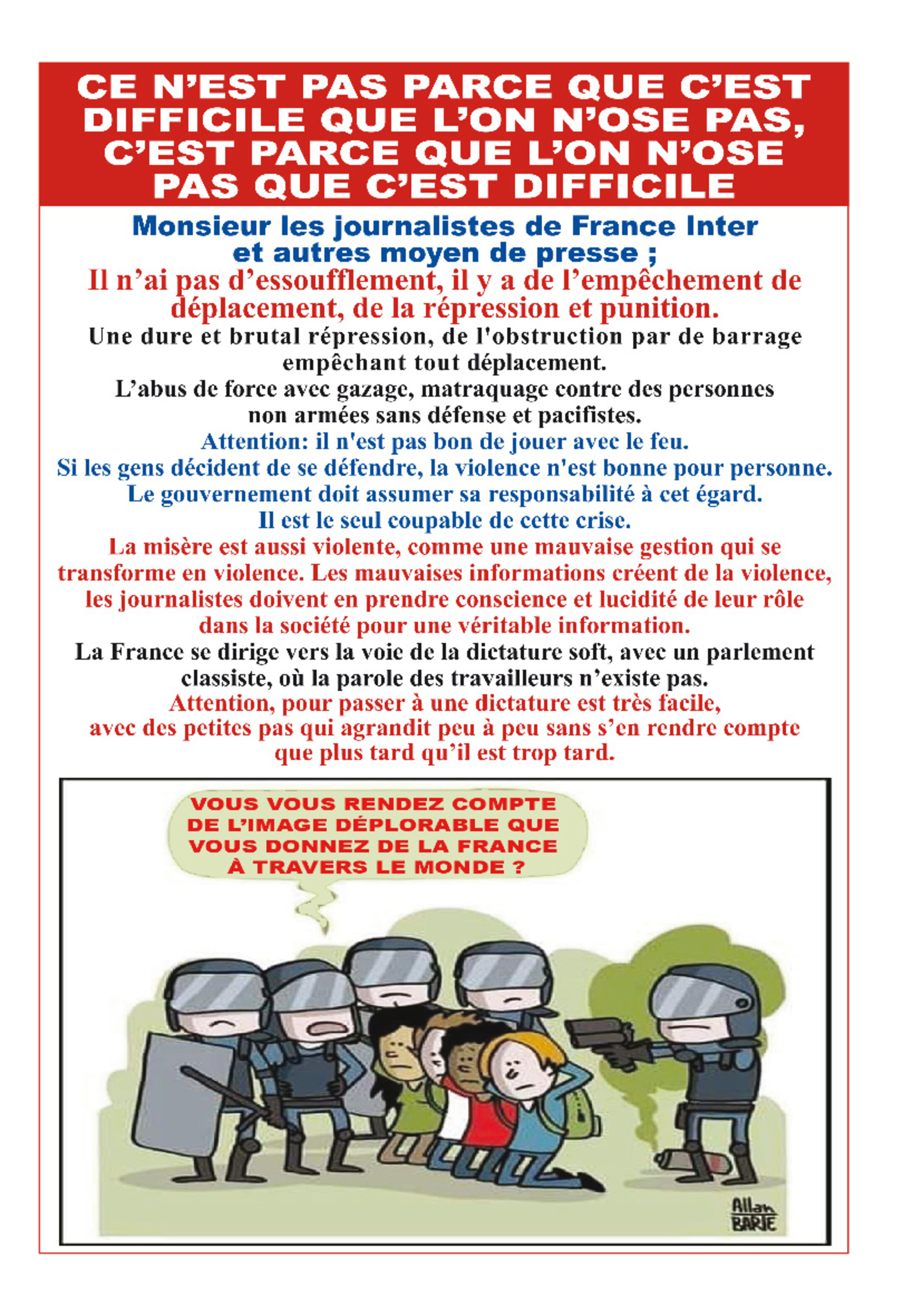 Monsieur les journalistes de France Inter et autres moyen de presse ; Il n’ai pas d’essoufflement, il y a de l’empêchement de déplacement, de la répression et punition. Une dure et brutal répression, de l'obstruction par de barrage empêchant tout déplacement. L’abus de force avec gazage, matraquage contre des personnes non armées sans défense et pacifistes. Attention: il n'est pas bon de jouer avec le feu. Si les gens décident de se défendre, la violence n'est bonne pour personne. Le gouvernement doit assumer sa responsabilité à cet égard. Il est le seul coupable de cette crise. La misère est aussi violente, comme une mauvaise gestion qui se transforme en violence. Les mauvaises informations créent de la violence, les journalistes doivent en prendre conscience et lucidité de leur rôle dans la société pour une véritable information. La France se dirige vers la voie de la dictature soft, avec un parlement classiste, où la parole des travailleurs n’existe pas. Attention, pour passer à une dictature est très facile, avec des petites pas qui agrandit peu à peu sans s’en rendre compte que plus tard qu’il est trop tard.