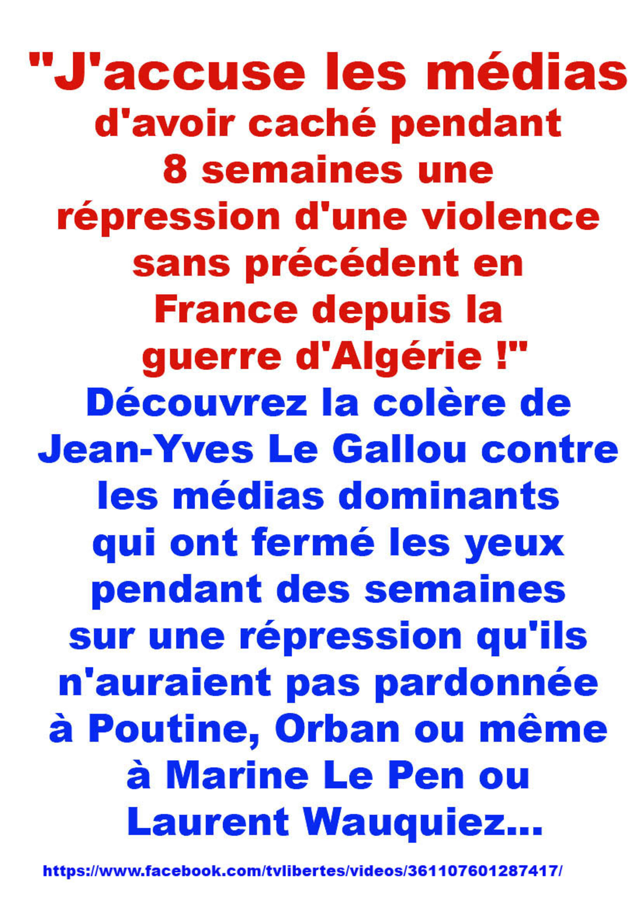 "J'accuse les médias d'avoir caché pendant 8 semaines une répression d'une violence sans précédent en France depuis la guerre d'Algérie !"