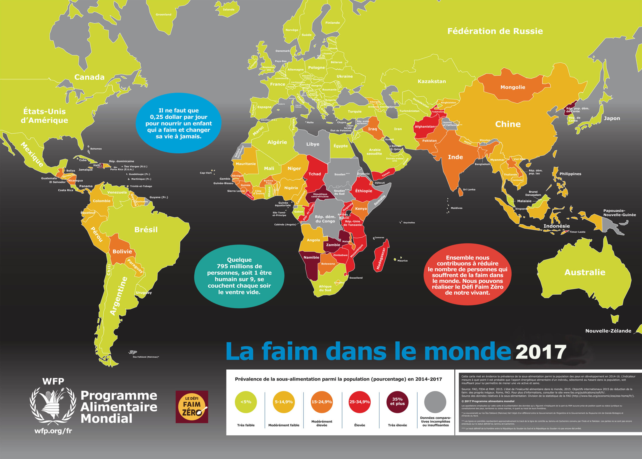 Selon un rapport de l’ONU, la faim dans le monde continue d’augmenter 821 millions de personnes souffrent à présent de la faim et plus de 150 millions d’enfants accusent des retards de croissance, menaçant ainsi l’objectif Faim Zéro. On peut remarquer que le nombre de personnes souffrant de la famine à travers le monde diminue. Ou souligner qu'elles sont encore 821 millions. Pour Thanksgiving, chaque Américain a consommé environ 4.500 calories en nourriture durant ce seul repas. Au réveillon de Noël, un Français en consomme presque 2.400 calories en moyenne. Mais dans de nombreux pays à travers le monde, chaque personne a du mal à avoir accès à plus de 2.000 calories par jour.