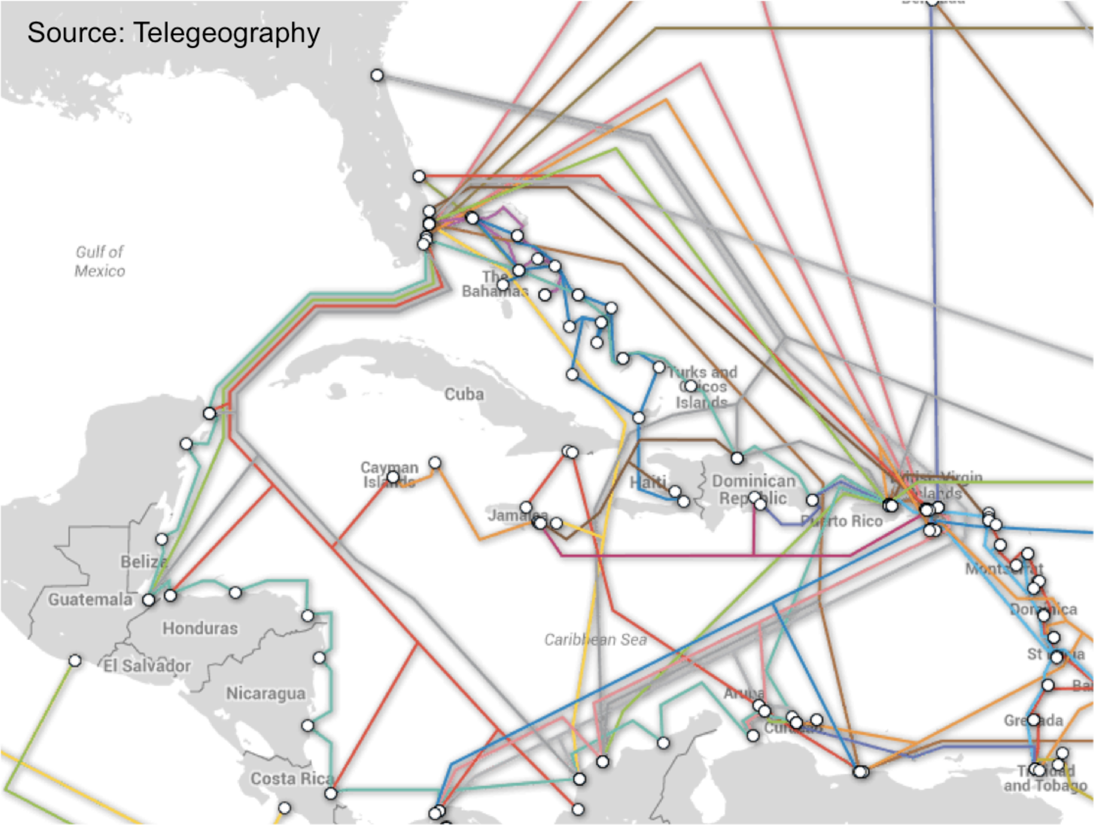 A voir la carte des câbles optiques baignant sur les fonds marins de la mer des Caraïbes, on comprend comment Cuba est cerné par l’internet des milliardaires.