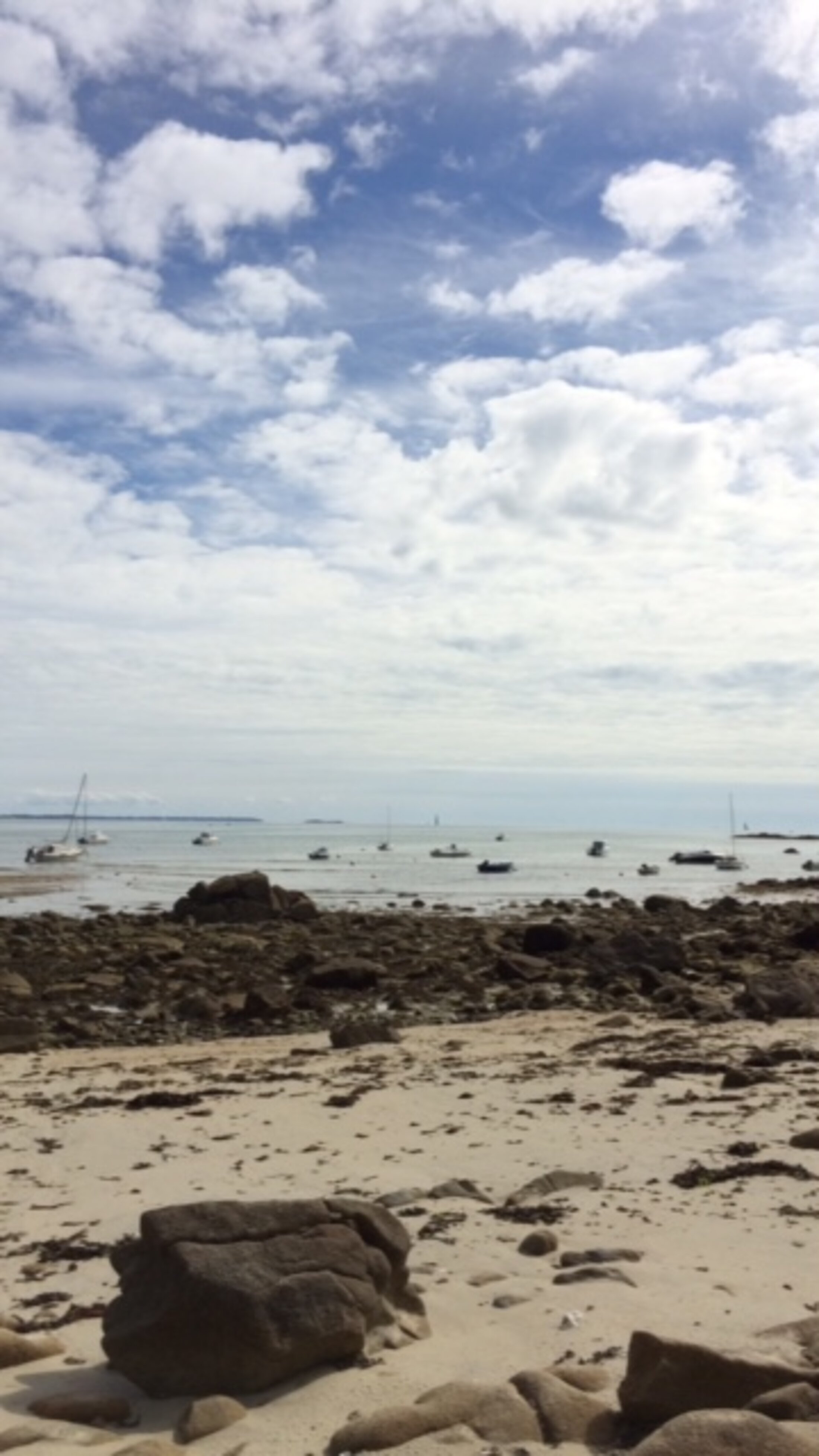 Chassée par un gros nuage gris, je trouve, quelques dizaines de mètres et de rochers plus loin, l’abri d’une petite crique au panorama énorme : du Men Dû aux contours de Houat au Sud, le bord Nord de la Baie m’offre sa splendeur à l’heure où le jusant reprend ses forces pour repartir à l’assaut des langues de sable dévoilées par la marée basse.