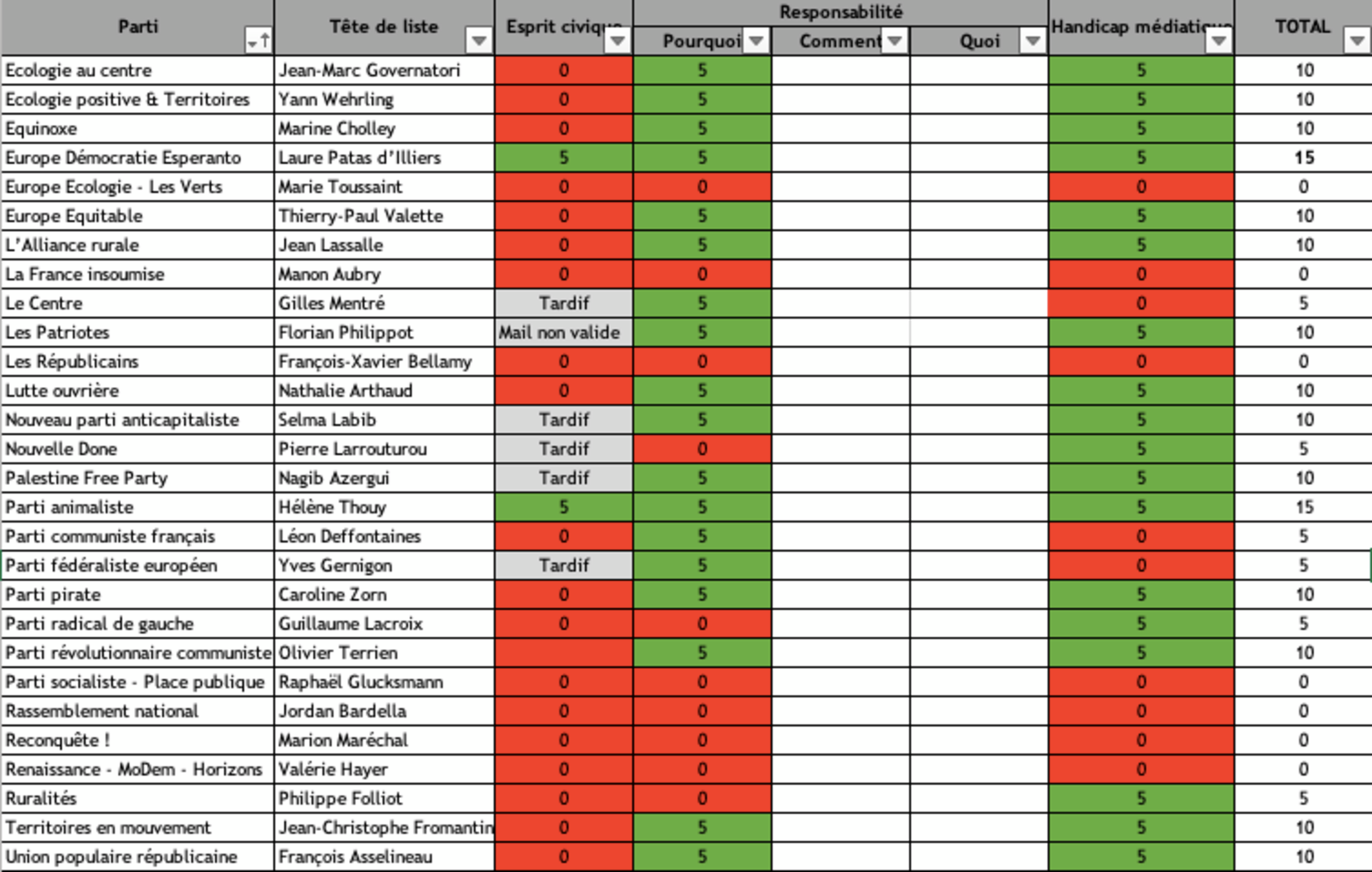 Cartographie de la qualité des listes engagées dans les élections européennes. En vert et rouge conformément au code du Progrès. Par contre, contrairement à tous les algorithmes utilisés par le Pouvoir, celui-ci peut être discuté. En attente de vos propositions pour se rapprocher au plus près de la Réalité.