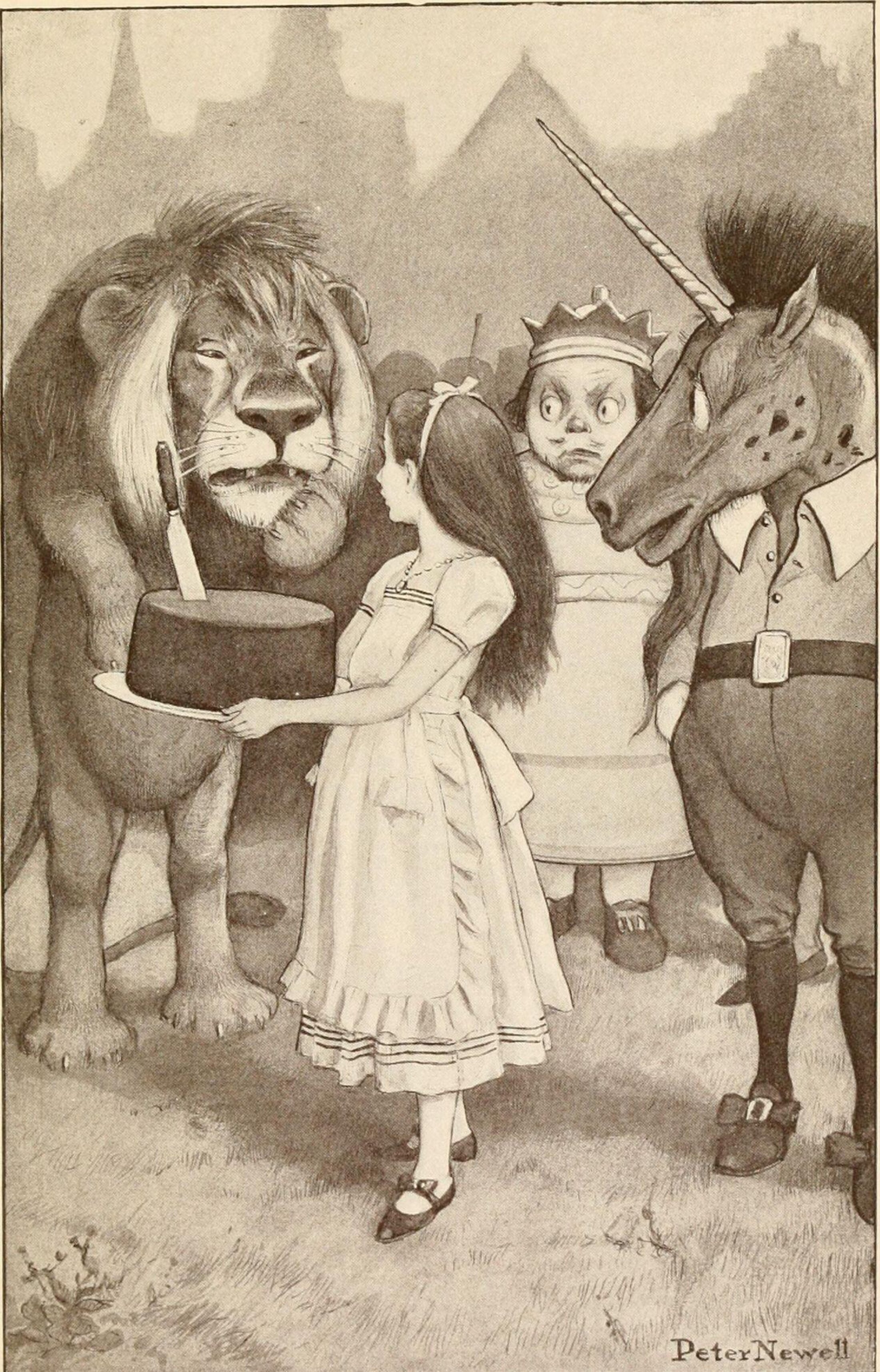 Pas très à l'aise entre ces deux grosses bêtes, le roi demandait à Alice de distribuer des parts égales puis les couper, chose fort difficile car ces parts ne cessaient de se recoller en faveur du lion, ce que la licorne trouvait fort injuste.