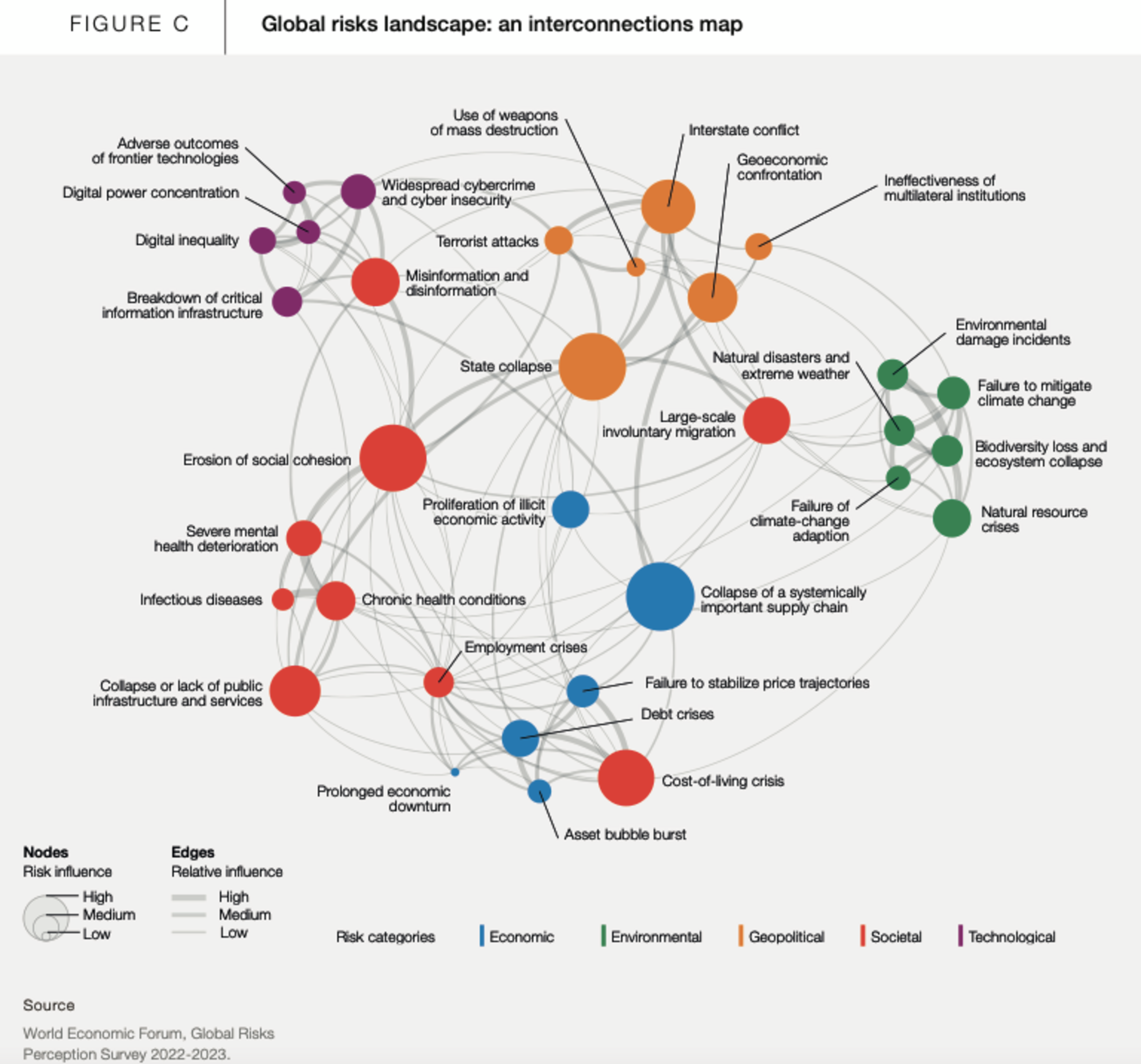 De son côté, Emmanuel Macron a annoncé le 23 août au Conseil des ministres qu’il réunirait les forces représentées au Parlement avant de préparer « des projets de lois » ayant « des marqueurs très forts d'autorité et d'unité ». Les intérêts du peuple étant fort mal représentés, il s'agira plus probablement du placage au niveau national des priorités établies par Davos sur base de la cartographie ci-dessous, le paysage des risques et des opportunités établi en 2022-2023 par WEF au niveau mondial, en vue de faire voter en 2024 les lois au plus fort potentiel de rentabilité.