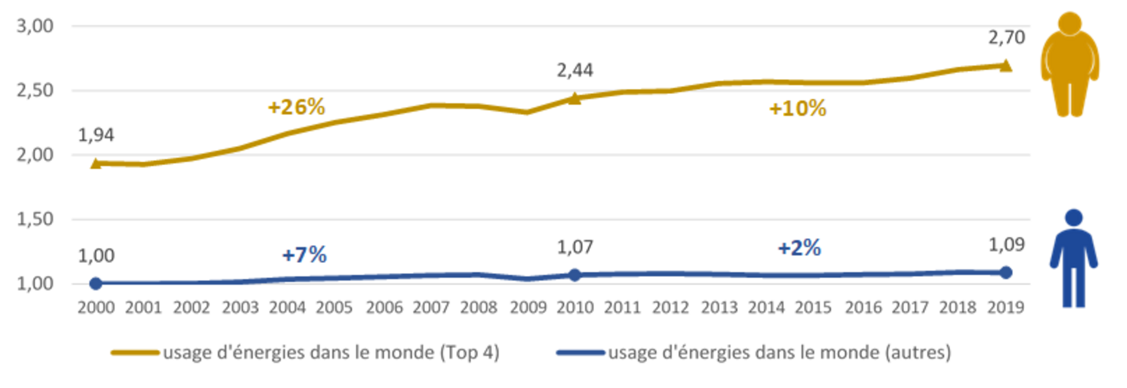 A la lecture de ces graphiques, nous pourrions penser que les 2 ensembles se valent, puisque globalement le mix énergies carbonées/décarbonées est sensiblement le même. Mais… les deux groupes ne sont pas de même taille, loin de là ! En effet, les 4 premières économies ne représentent que 2 milliards d’habitants, contre 5,7 pour le reste du monde. Ramenons la consommation d’énergies à une base 1 = habitant reste du monde 2000 nous obtenons :