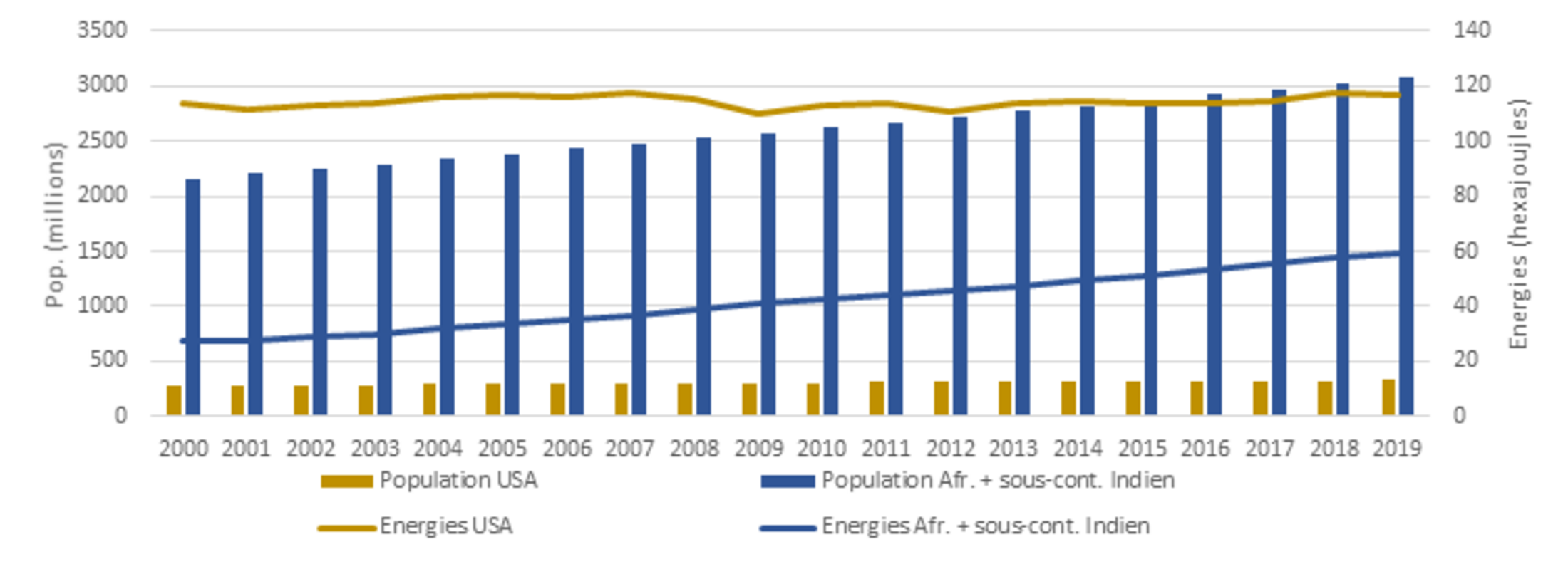 Malgré la forte croissance en population et donc en énergies consommées des pays d’Afrique et du sous-continent indien, cet ensemble ne pèse que pour 50% des consommations énergétiques des USA. En suivant les tendances actuelles, il faudrait attendre 2036 pour que tous ces pays cumulés rattrapent les seuls USA de 2019. Les 3 milliards d’habitants des régions évoquées seraient alors 6 milliards, ce qui implique une croissance démographique déraisonnable (presque deux fois supérieure à celle calculée par l’ONU). Mais même en admettant ces chiffres, s’attaquer aux ventres des femmes pauvres aujourd’hui sans remettre en question nos consommations, c’est s’occuper d’après-demain alors que nous détruisons demain.