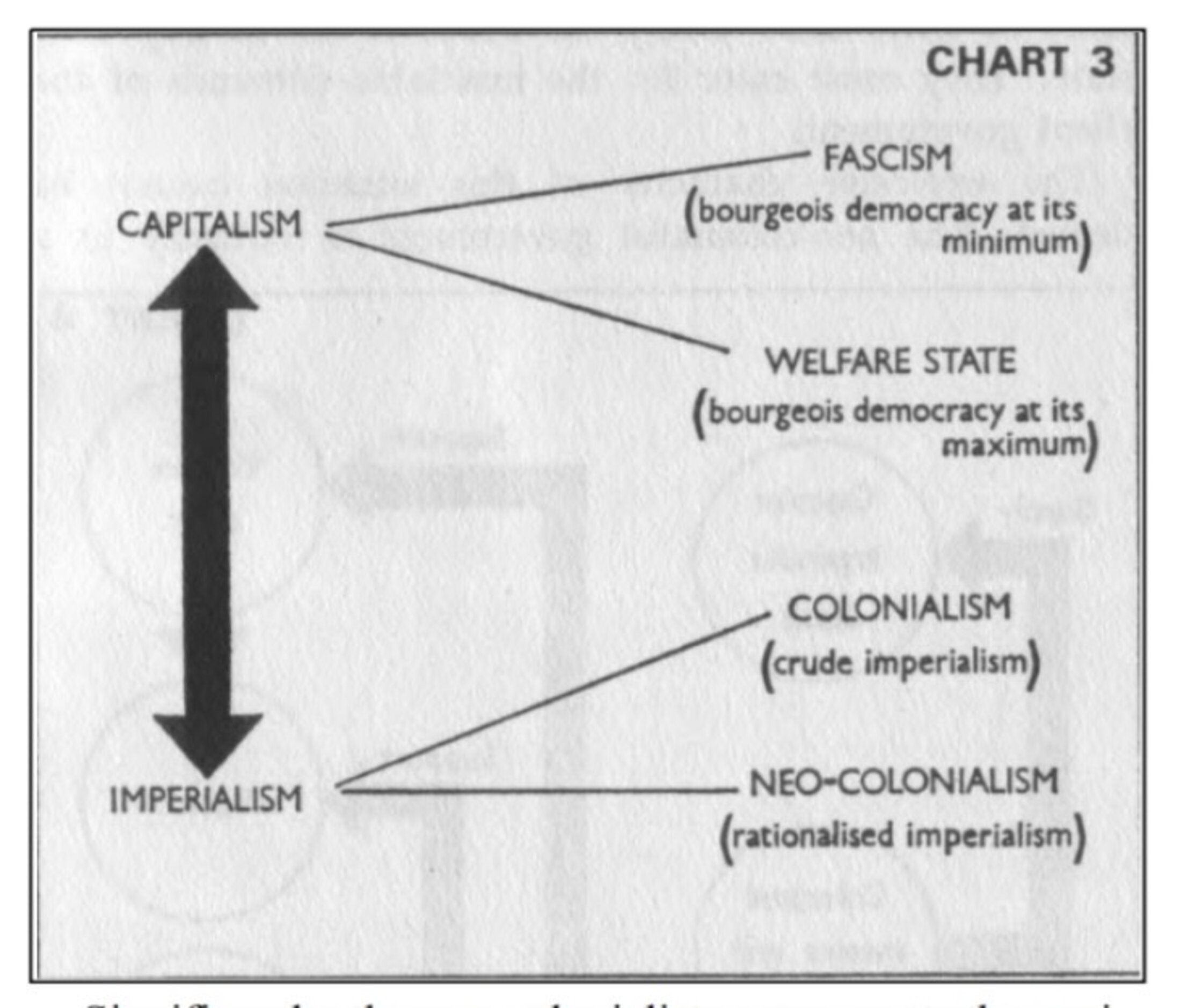 Plutôt que les thèses sur le populisme et les affects (xv), populaires chez les gauches occidentales, on trouve chez Kwame Nkrumah (xvi) une analyse anticoloniale des fluctuations du système politique des métropoles coloniales, développée en approfondissant la réflexion de Lénine sur les relations parasitaires entre les impérialistes et leurs dépendances. Selon son analyse, dans une société capitaliste, le fascisme est une manifestation autoritaire et chauvine du capital (la démocratie à son minimum) qui se traduit à l’extérieur par des formes plus ‘crues’ de prédation. Au XXème siècle, sous la pression des mouvements syndicaux à l’intérieur et des mouvements anticoloniaux à l’extérieur, la transition s’impose vers les réformes instaurant l’État-providence (démocratie bourgeoise à son maximum) à l’intérieur et le néocolonialisme à l’extérieur dont les hauts profits taxés permettent de financer en partie l’État-providence.