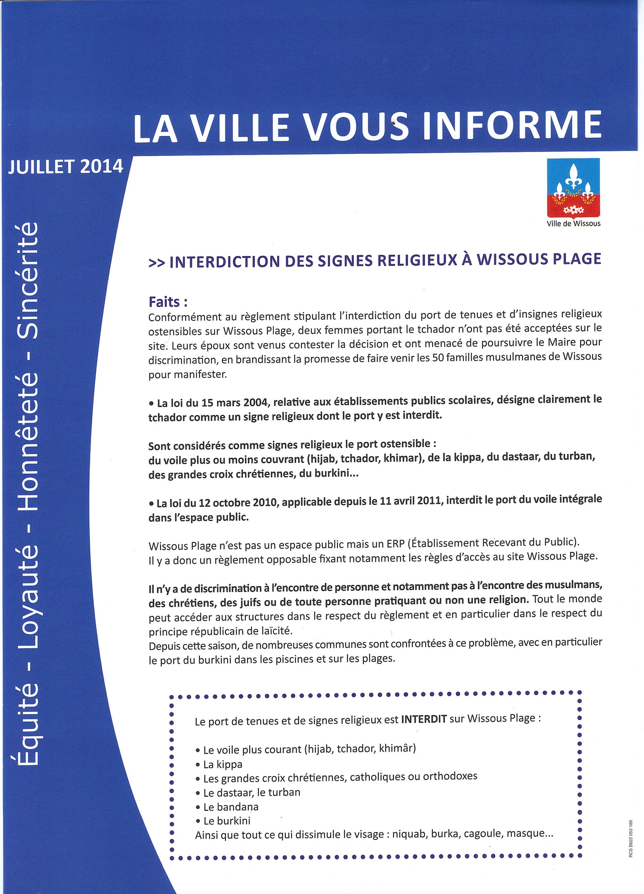 Sur sa page Facebook, le maire de la ville, Richard Trinquier avait publié en 2012 un montage montrant une femme et sa fillette, toutes deux entièrement voilées, entourées de deux sacs poubelle. Pour illustrer cette photo, la légende suivante : « photo de famille ». A l’été 2014, il avait pris un arrêté municipal interdisant l’entrée à la plage municipale de la ville à tout porteur de signes religieux. Invoquant la loi de 2004 sur l’interdiction de ces signes à l’école, il avait trouvé logique que cette loi s’y applique car la plage artificielle y recevait des groupes scolaires