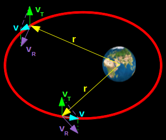 Sur cette figure d'une ellipse, sont représentées deux situations différentes pour un satellite. La flèche jaune est le rayon vecteur. La flèche turquoise est la vitesse réelle du satellite. La flèche verte est la vitesse de translationvT, toujours colinéaire au petit axe de l'ellipse. La flèche mauve est la vitesse de rotationvR, toujours perpendiculaire au vecteur rayon.