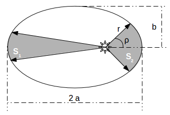 La loi des aires : les surfaces S1 et S2 sont égales, et le temps pour les balayer sont identiques.rest le rayon vecteur,ρest l'anomalie vraie, a et b sont respectivement le demi grand et le demi petit axe de l'ellipse.