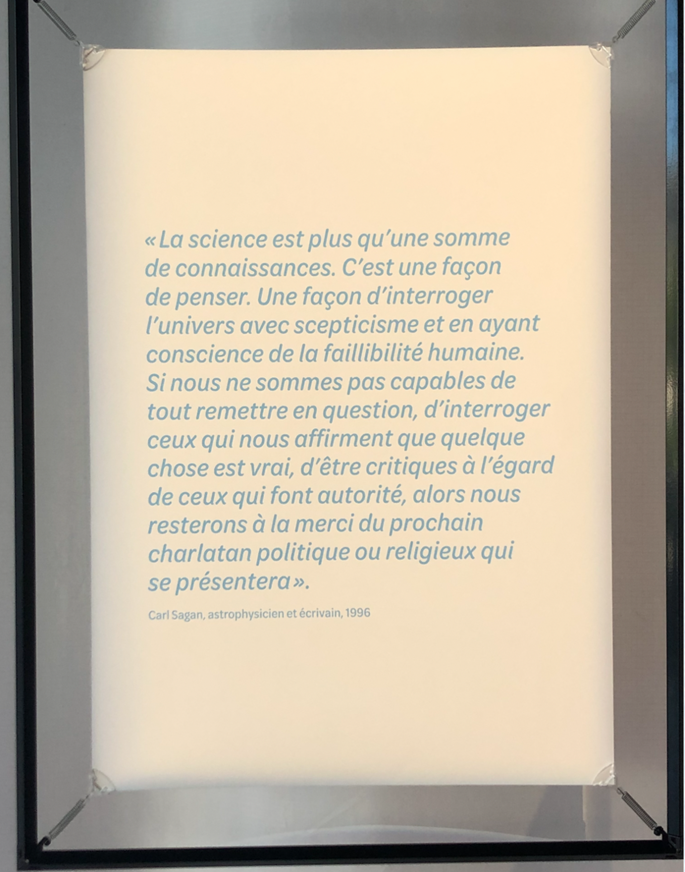 Par ailleurs, la citation de Carl Sagan ci-dessous, datée de 1996 et exposée dans la salle, est à lire attentivement: