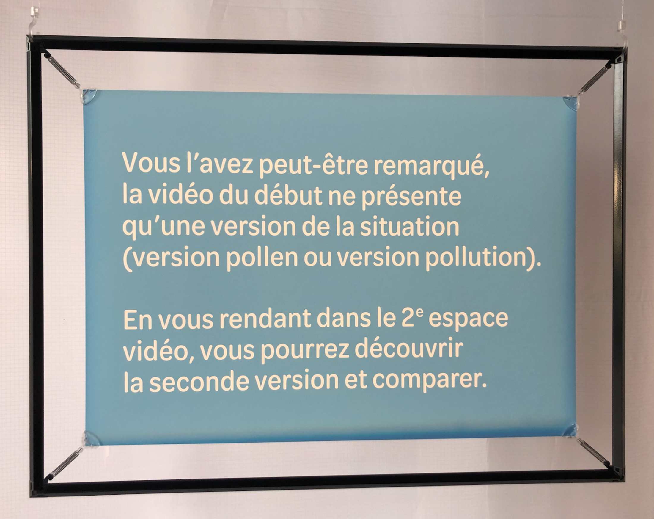 Le principe de l'exposition est simple. Elle présente une situation fictive, mais forcément reliée à une situation encore en cours: une pandémie mortelle qui est en train de s'installer en Suisse romande. Cette alerte sanitaire produit des symptômes respiratoires dont la cause n'est pas élucidée. Le public est ainsi invité à visionner l'une, et seulement l'une, de deux vidéos différentes qui présentent cette actualité inquiétante et explicitent un prétendu état des connaissances. Avec les mêmes dispositifs, les mêmes intervenants et en partie les mêmes documents, les deux vidéos donnent chacune une explication différente: l'une évoque les effets d'un nouveau pollen arrivé dans la région sous l'effet du réchauffement climatique, l'autre les effets d'une pollution industrielle à la suite d'une modification technologique.