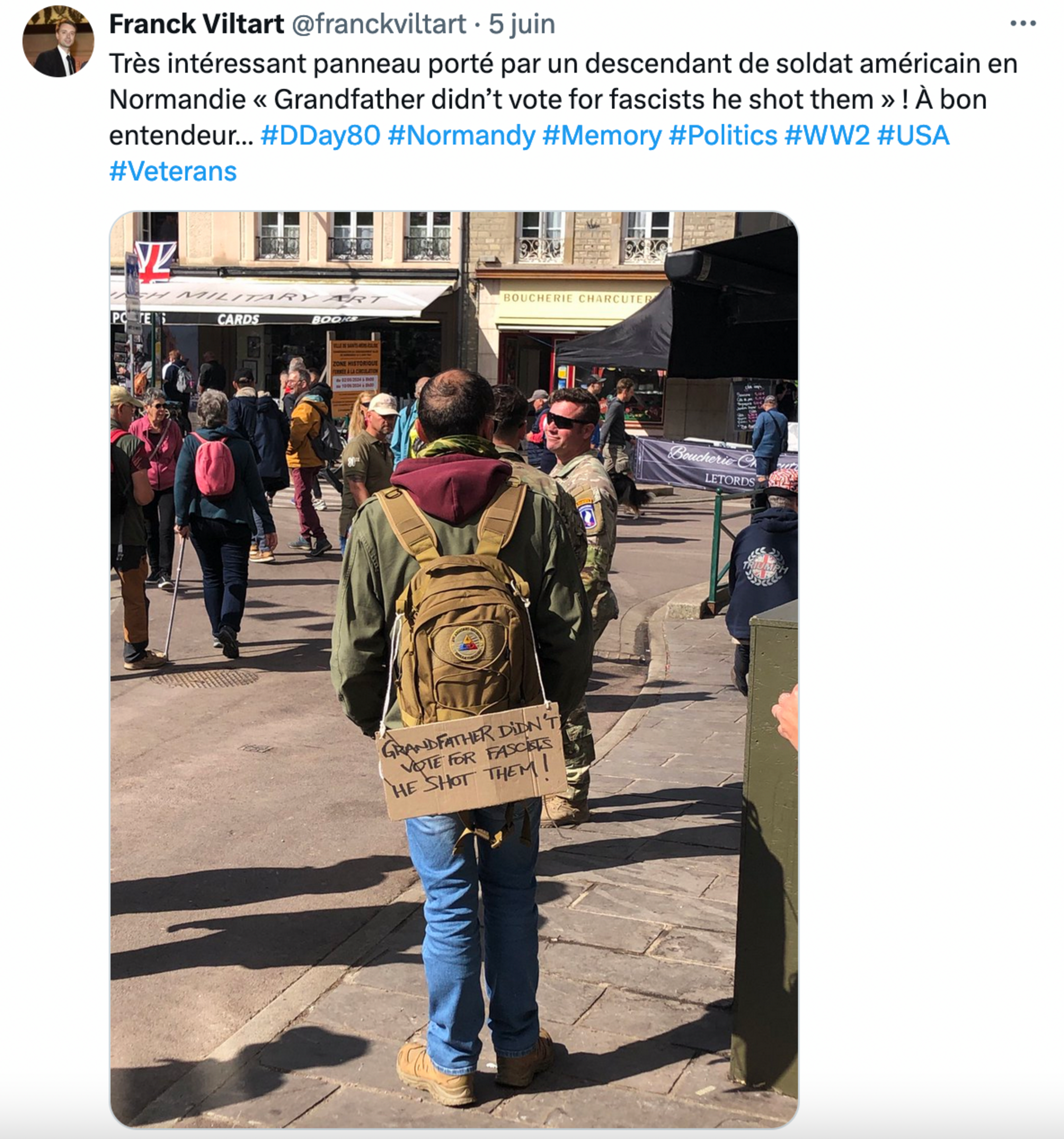 La seconde est l’image d’un jeune adulte vraisemblablement anglophone aux commémorations du Débarquement de Normandie qui porte l’inscription suivante que nous traduisons de l’anglais : « Mon grand-père ne votait pas pour les fascistes. Il les abattait ! »