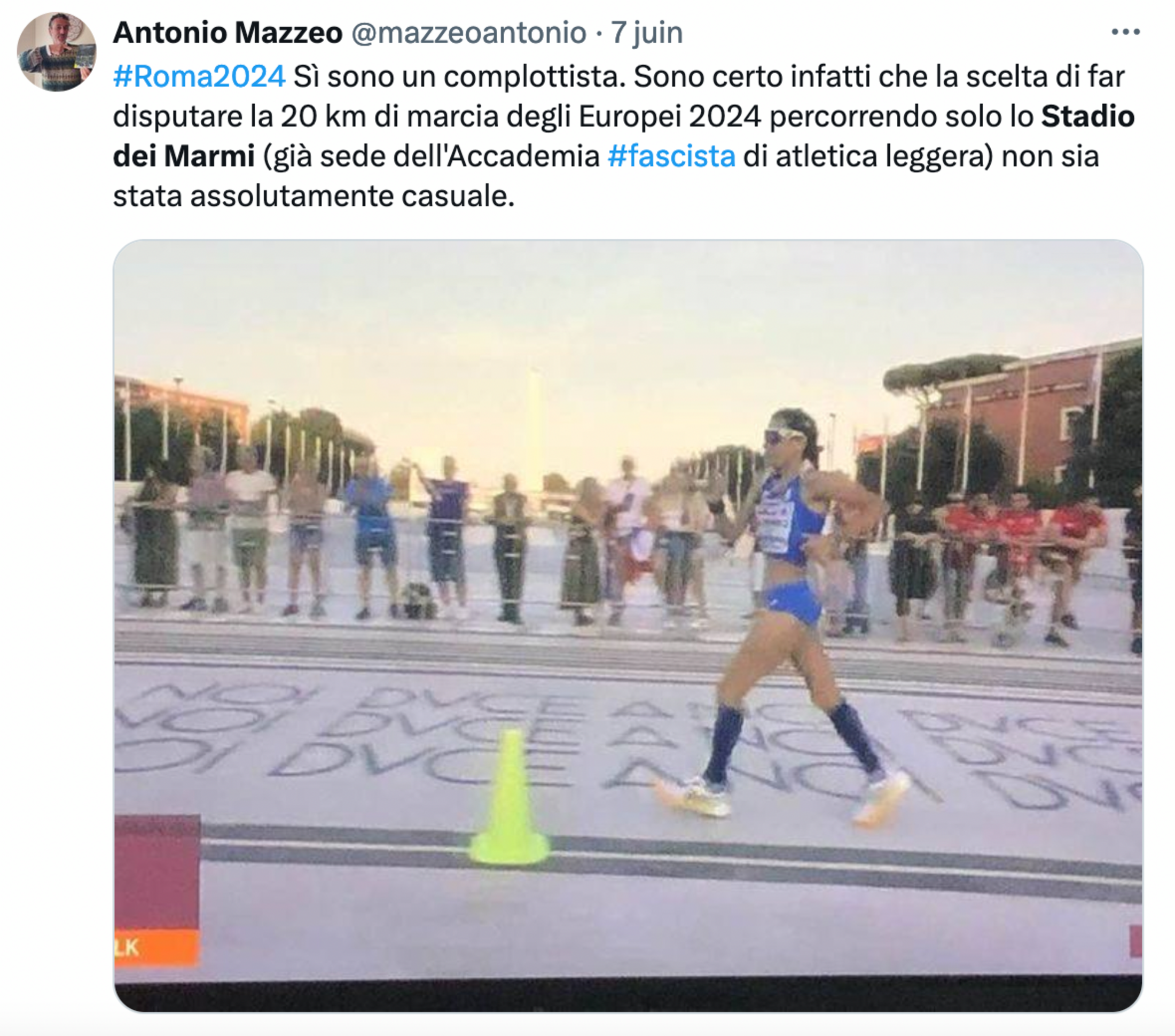 La première est une capture d’écran de la retransmission des 20 km de marche des femmes aux derniers championnats d’Europe de Rome. On y voit une marcheuse en plein effort qui foule des inscriptions « Duce Duce Duce », celles qui se trouvent dans la zone du Stade des Marbres, juste à côté du Stade Olympique dans le quartier du Foro Italico, l’ancien Foro Mussolini.