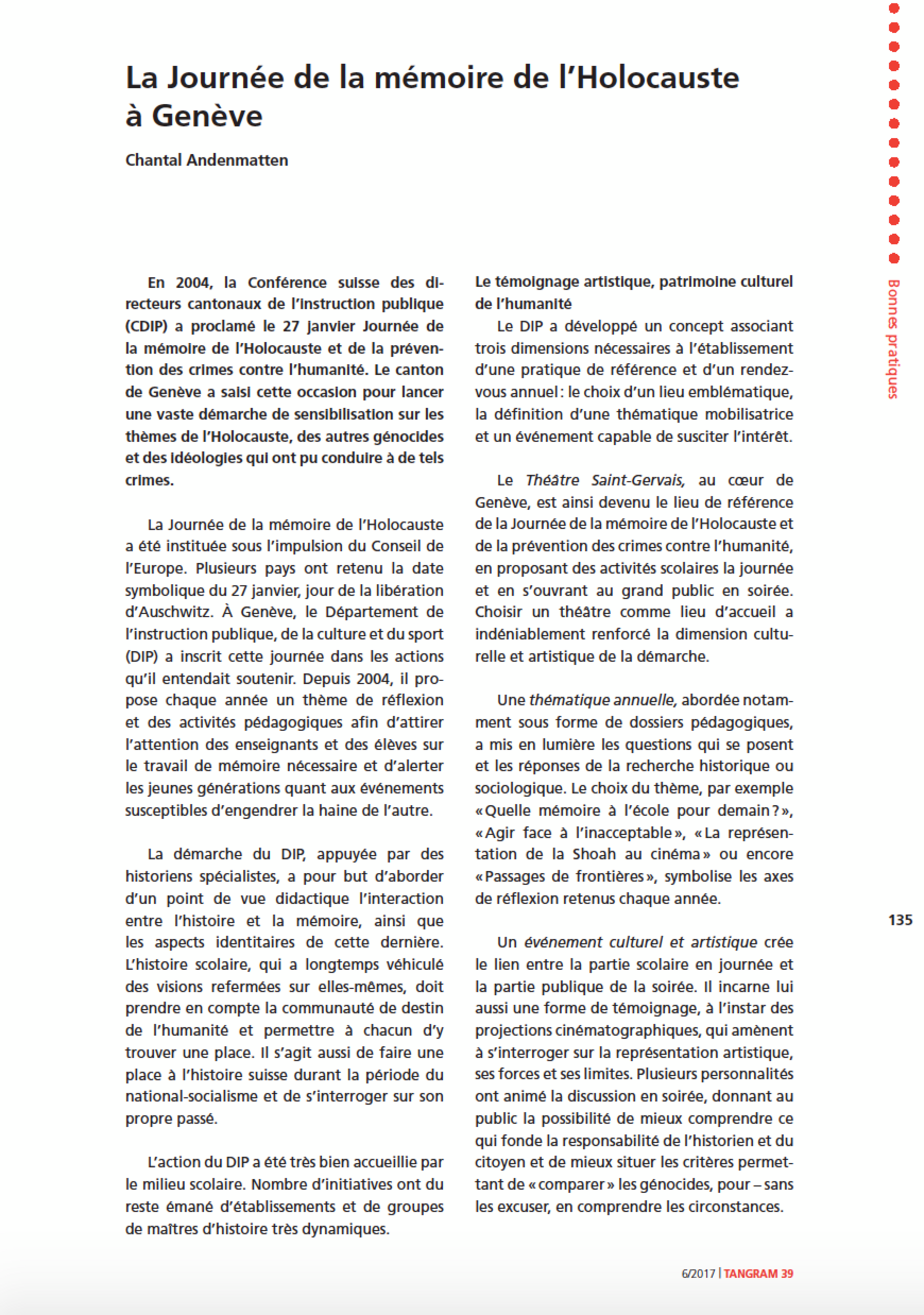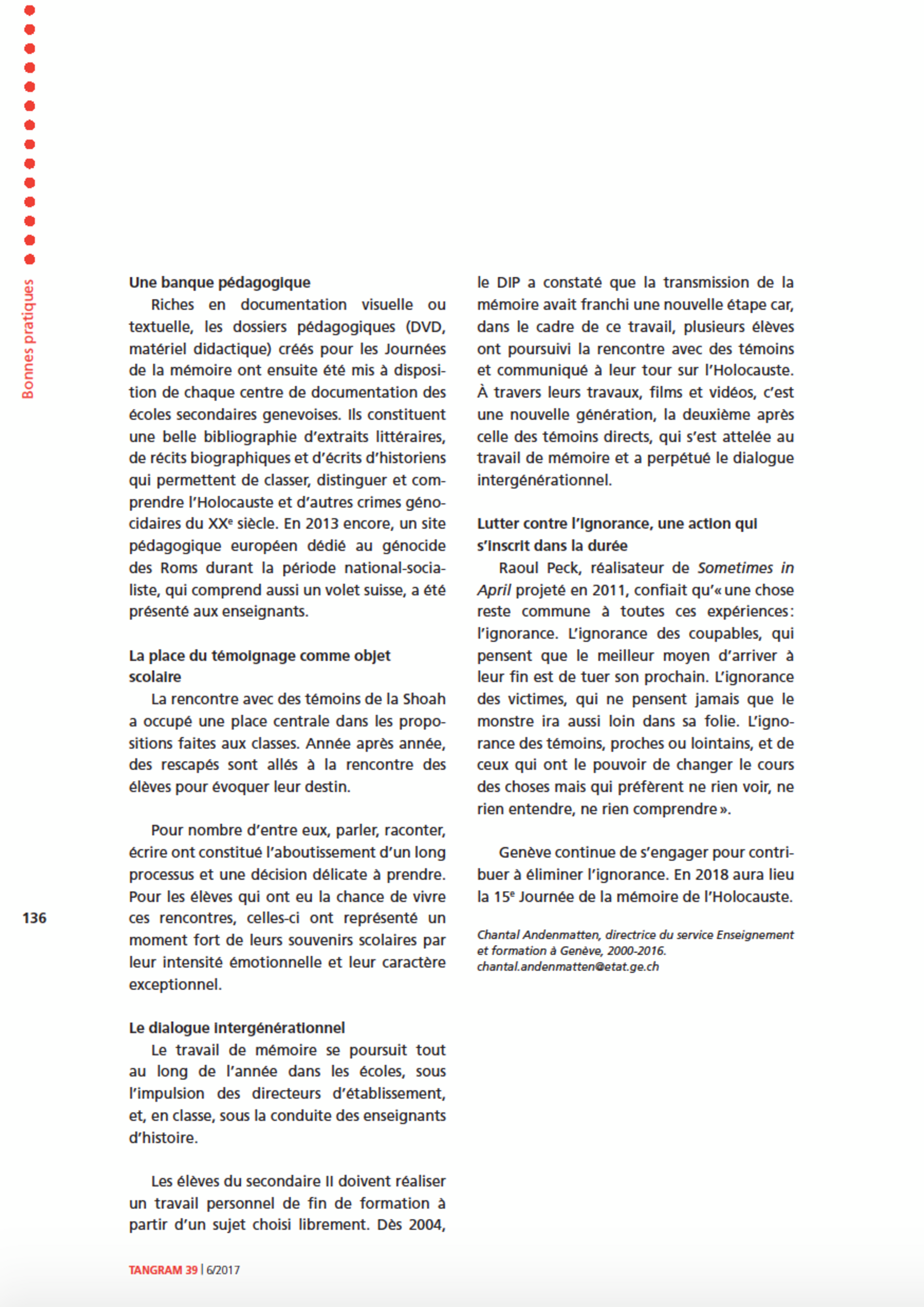 À propos de l'expérience genevoise, Chantal Andenmatten, qui a longtemps été la directrice responsable de ce dossier pour le Département de l'Instruction publique de Genève, avait rédigé cet article en juin 2017 dans la revue TANGRAM éditée par la Commission fédérale contre le racisme :