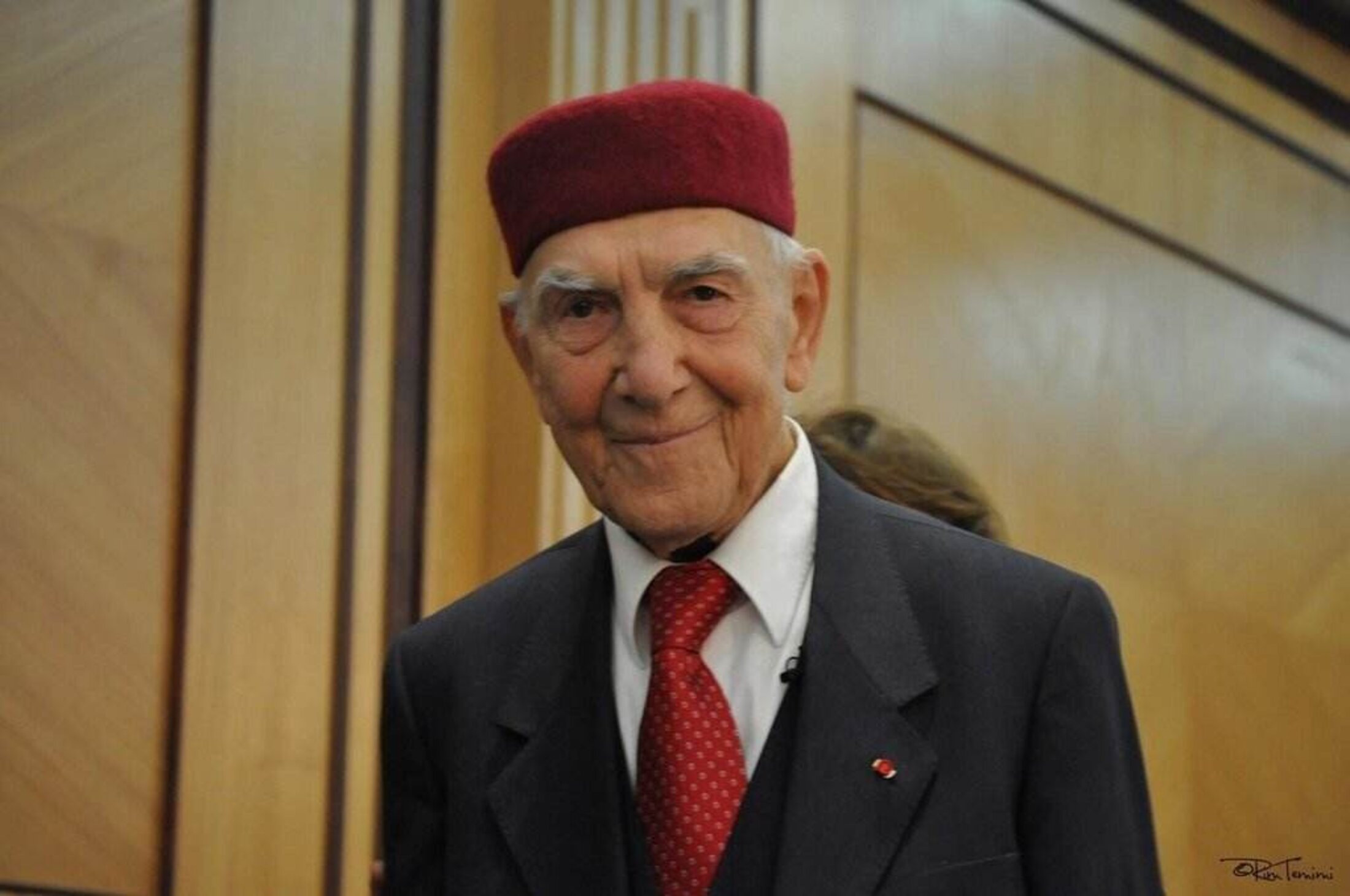 Stéphane Hessel portant une chéchia, le couvre-chef national de la Tunisie.
