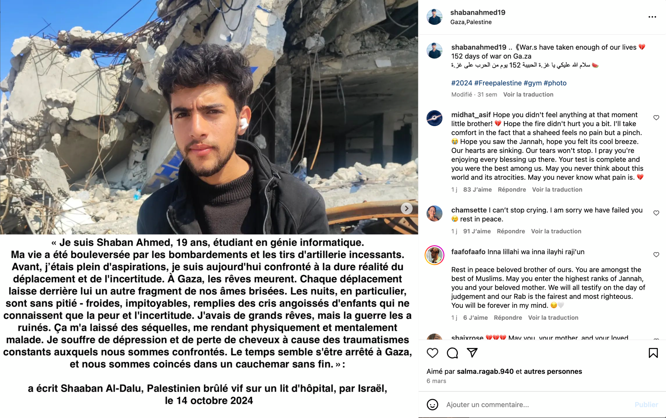 Plusieurs autres patient·es et réfugié·es palestinien·nes étaient blessé·es ou mort·es brûlé·es vif·ves lors de cette frappe aérienne israélienne de l'hôpital des martyrs d'Al-Aqsa, à Deir Al-Balah, au centre de la bande de Gaza. L’hôpital a été pourtant décrété « zone humanitaire » par l’armée israélienne.