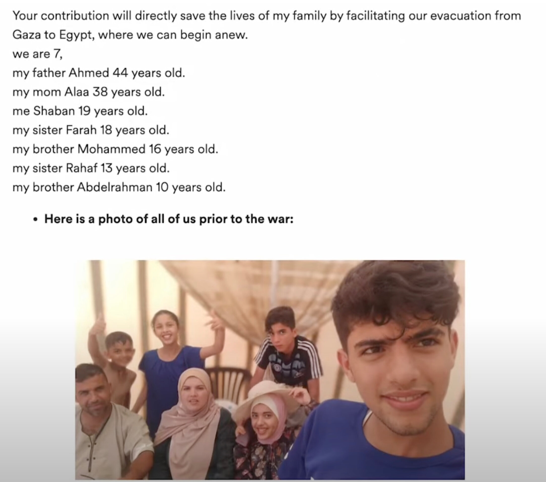 Shaaban Al-Dalu, 19 ans, atteint d'hépatite, était un brillant étudiant en ingénierie informatique; il a réussi ses derniers examens avec une moyenne de 97,9 %. Le 6 octobre, Shaaban avait survécu à une première frappe aérienne nocturne sur une mosquée où il dormait et qui a fait 20 morts. Il a été blessé derrière l'oreille. Sa mère, Alaa Al-Dalu, 38 ans, est aussi morte brulée vive à ses côtés. Les deux sont mort·es devant Mohammed, 16 ans, le frère de Shaaban, qui les a regardé·es brûler et n'a pas pu les sauver. Le père, Ahmed, 44 ans, et les deux sœurs de Shaaban, Farah, 18 ans et Rahaf, 13 ans, sont gravement brûlé·es et actuellement à l'hôpital. Abdelrahman, le petit frère, 10 ans, a succombé à ses brûlures; il est mort à l’hôpital, le 18 octobre, quatre jours après Shaaban.