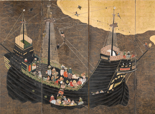 Kano Domi, "Bateau portugais apportant des marchandises au Japon" (art Nanban, Japon, 16e siècle). Il est possible de constater que ce sont des esclaves noirs qui s'occupent des opérations de navigation délicates.