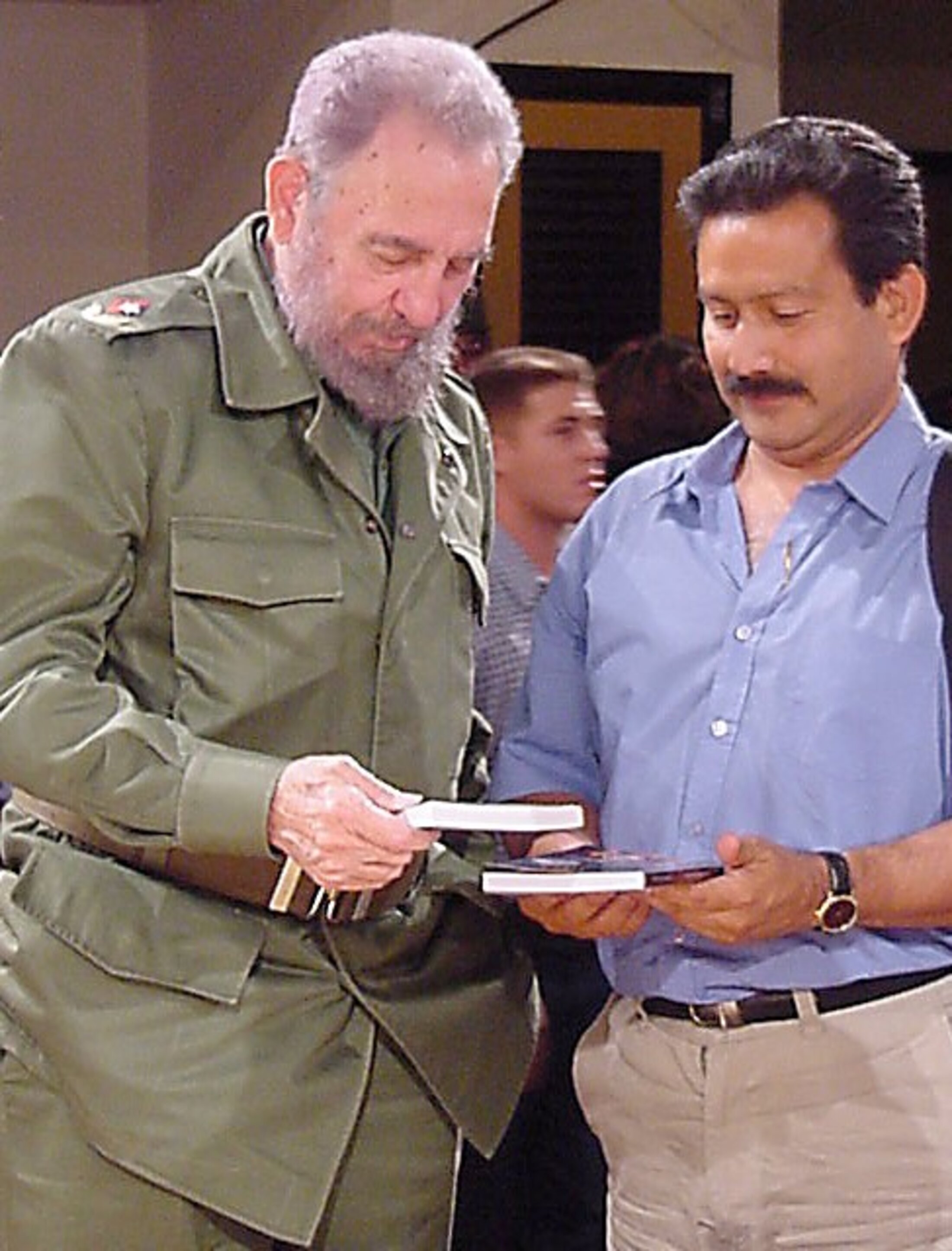Cuando Fidel dio por terminado nuestro encuentro, y yo me encontraba con las manos sin libros, se me acercó otro de los escoltas, y me dijo con voz grave pero con rostro cómplice: