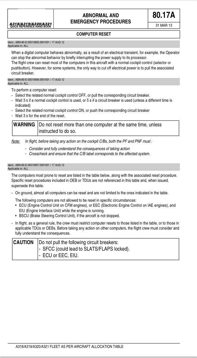 Et surtout elle n'indique pas que l'action, même fautive du captain, n'était pas la simple coupure de ces calculateurs, mais leur reset, c'est à dire tirer le breaker, attendre 5 secondes, et le repousser. ( une fois l'alimentation électrique rétablie, le reset dure 3 secondes )