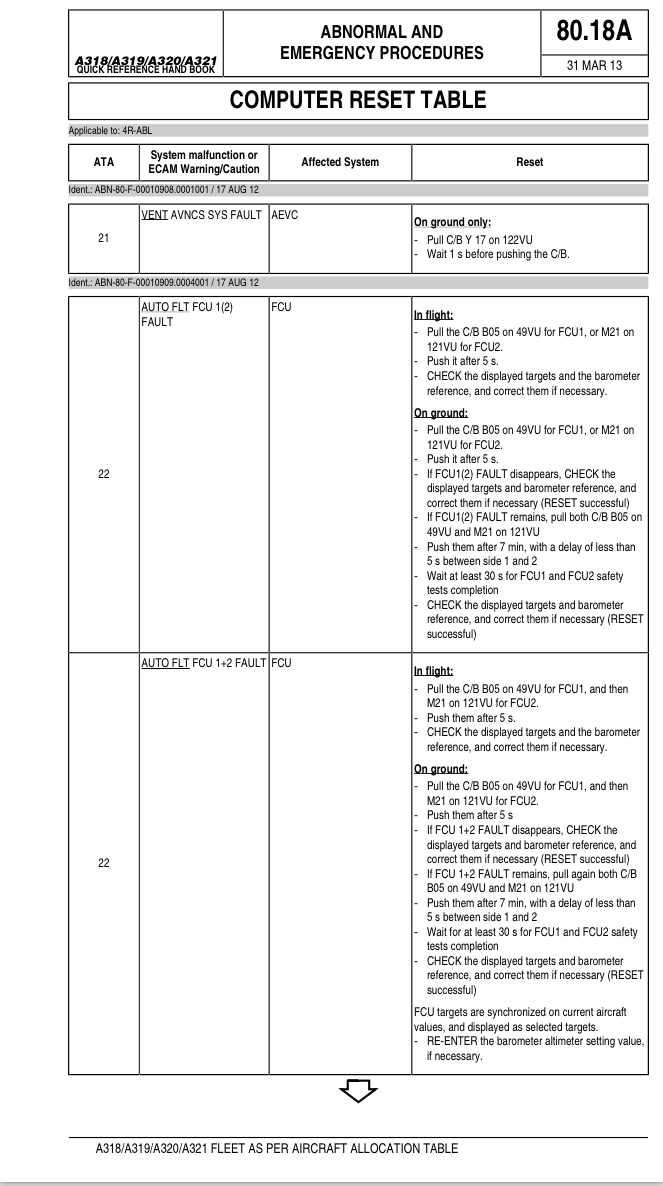 L'ensemble des possibilités de reset est très clairement détaillé dans une COMPUTER RESET TABLE page 80.18f, et bien entendu au regard des deux situations en vol ou au sol seulement.