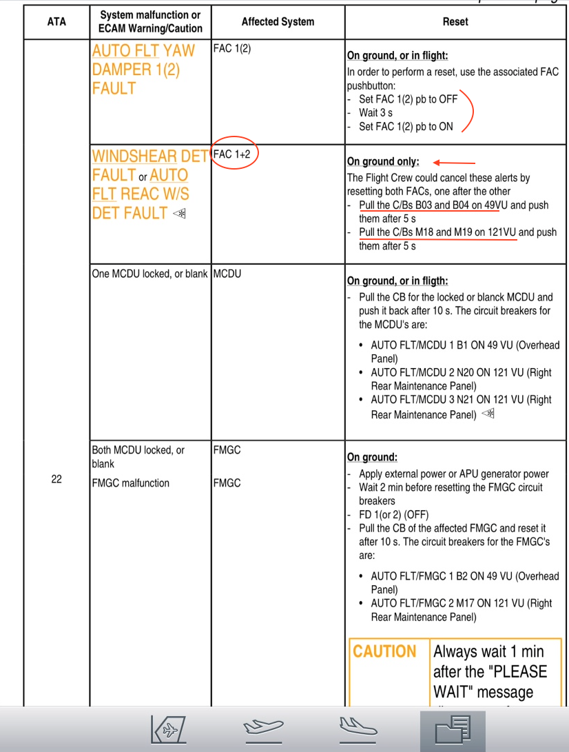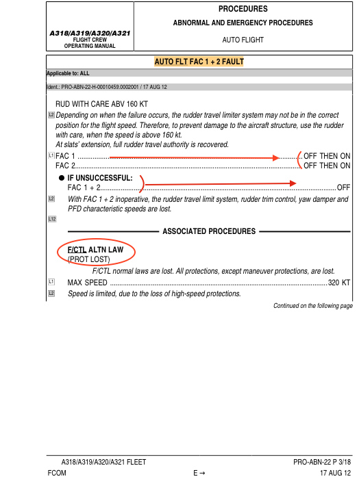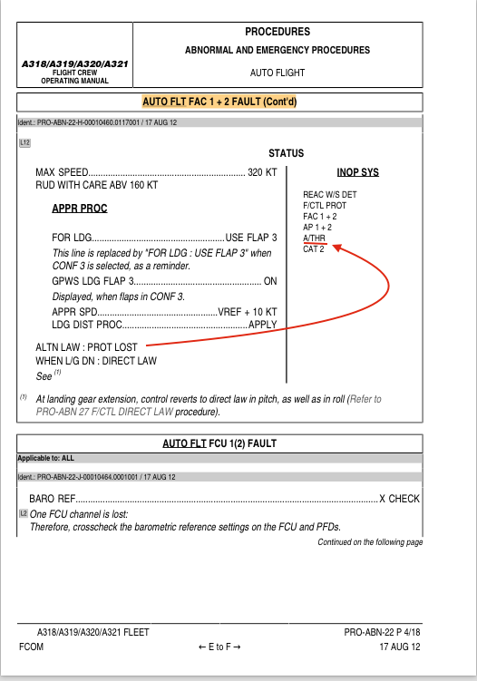 ICI le même préambule mais copie d'écran d'un iPad équipé de l'EFB d'Airbus ( electronic flight bag ), et LÀ les renseignement qui nous intéressent à propos des FACs, ( flight augmentation computer )