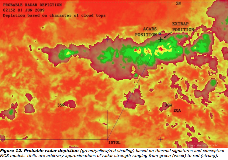 Dès le début un ancien météorologiste de la NASA avait " calculé " une prédiction de l'image radar que les pilotes de l'AF 447 avait pu avoir sous les yeux.Tim Vasquez dont voici ici la page, et là le blog professionnel,