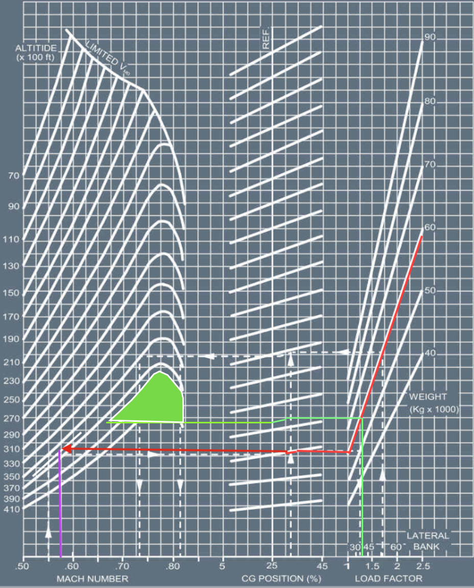 Protégé d'un facteur de charge de 1,3 G, le vol QZ8501 pouvait évoluer entre M 0.675 et M 0.82, ce qui signifie un domaine fort confortable, représenté ici.