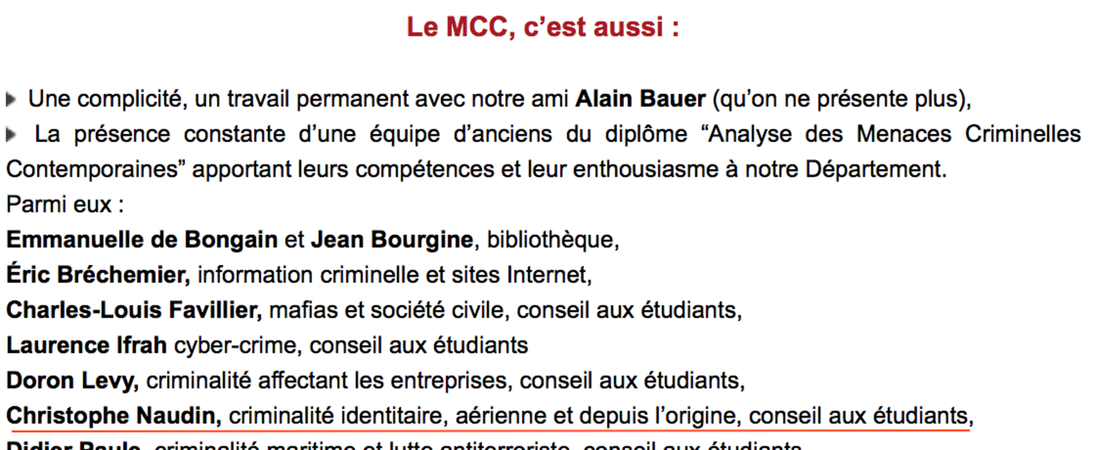 Sur la page de ce département MCC on voit apparaître le nom de Christophe Naudin, comme ancien du diplôme “Analyse des Menaces Criminelles Contemporaines” apportant ses compétences et son enthousiasme au dit Département.